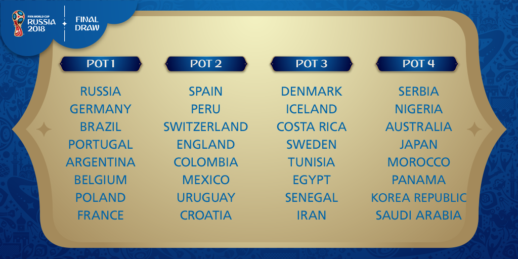 Kurada Avrupa kıtası ülkeleri hariç aynı kıtadan iki takım aynı grupta yer alamayacaklar. Aynı grupta en fazla iki tane Avrupa ülkesi olabilecek. Avrupa kıtasının farkı Dünya Kupası'na 14 tane ülke gönderiyor olması.