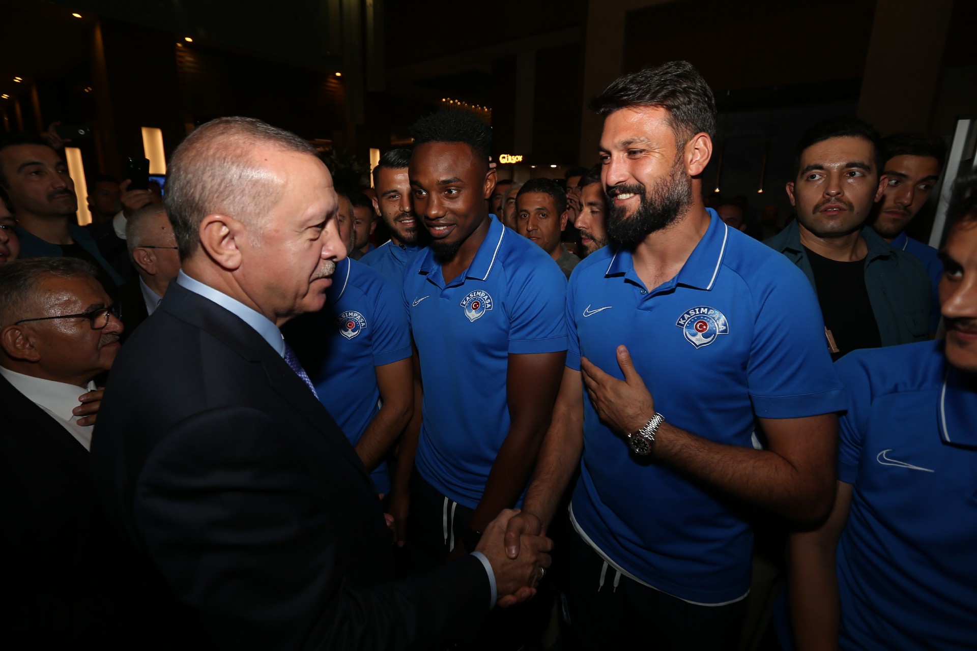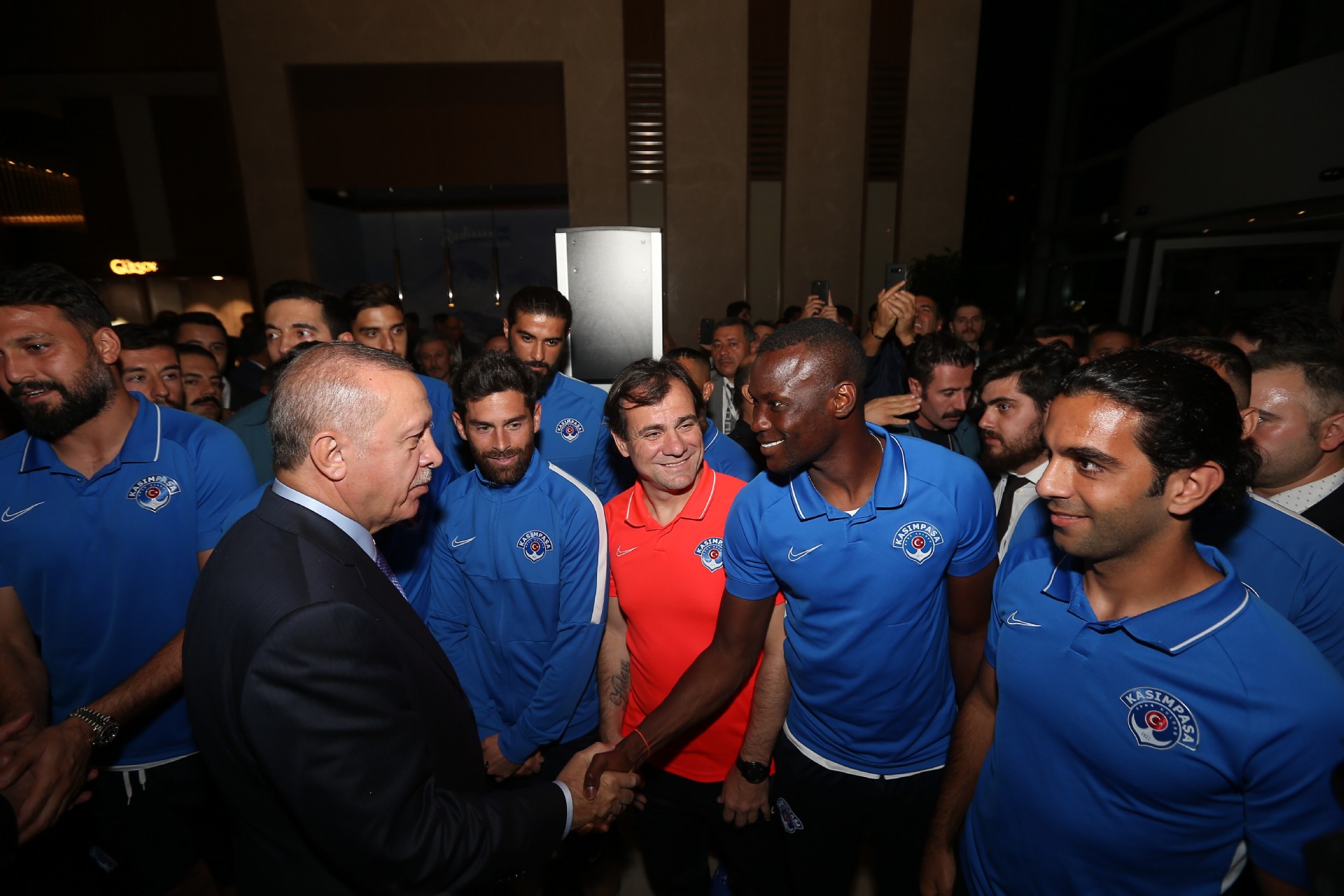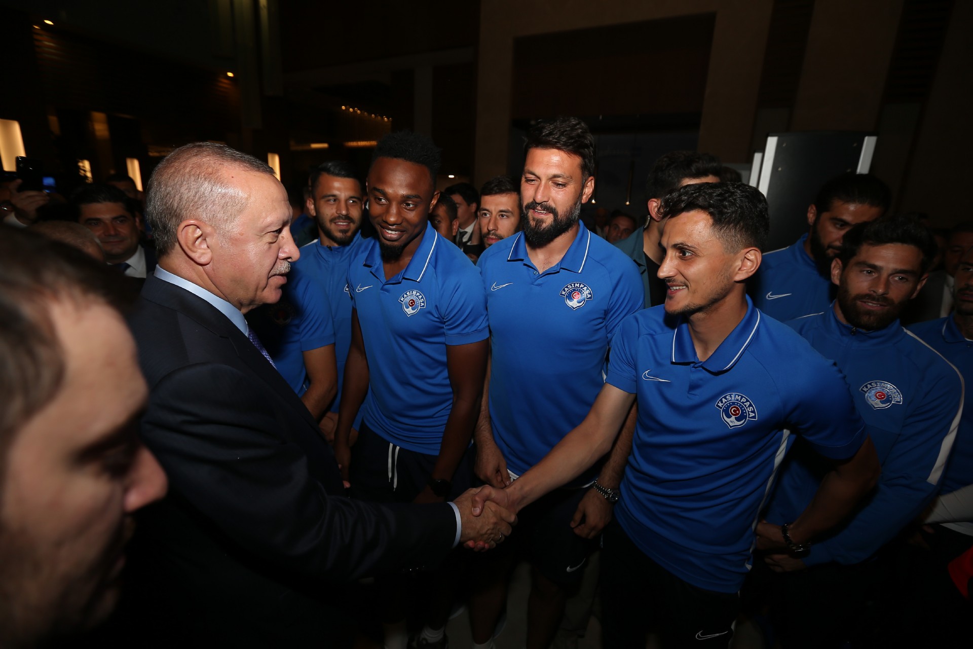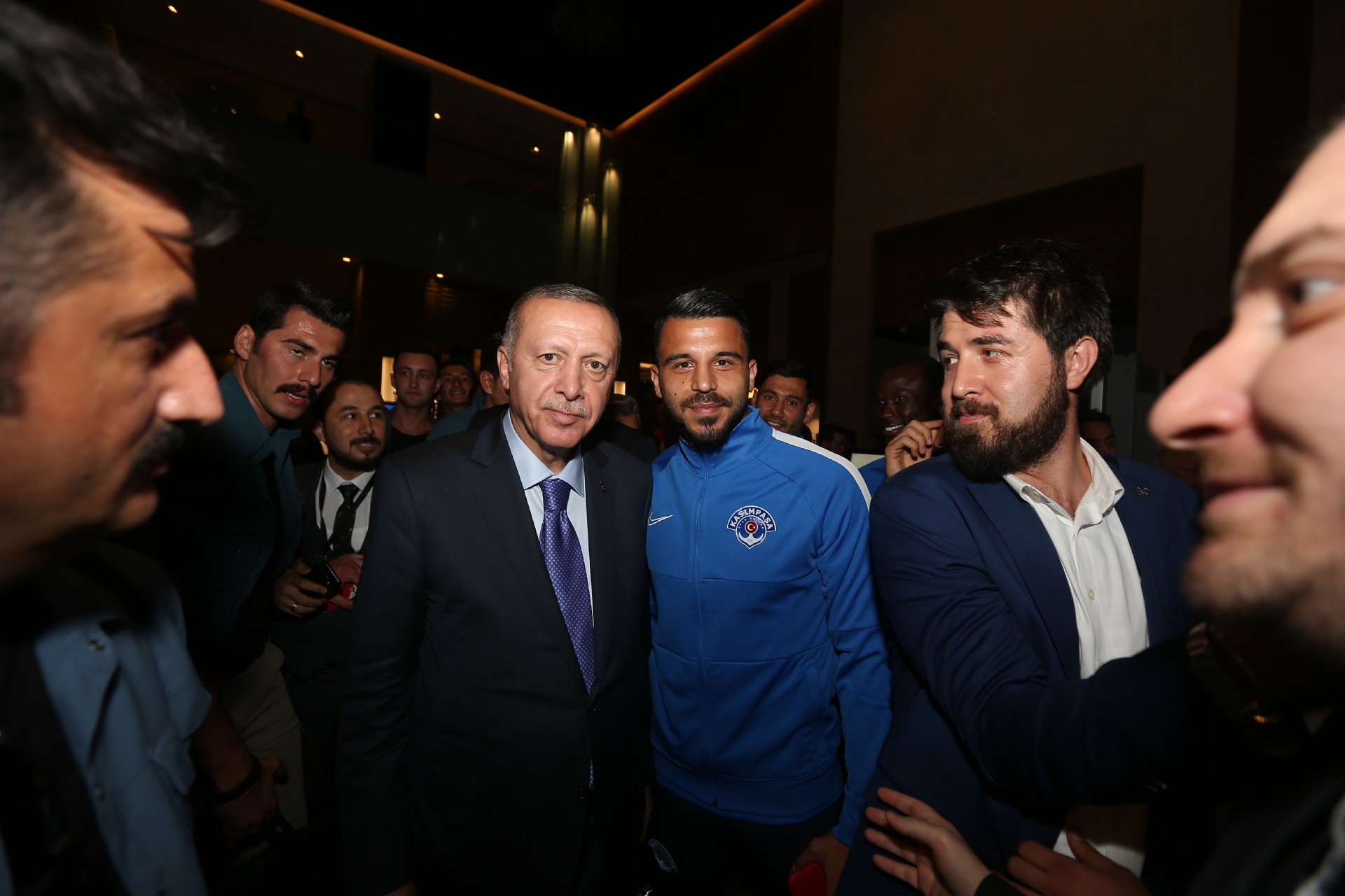 Cumhurbaşkanı Recep Tayyip Erdoğan, Kayserispor maçı için kentte bulunan Kasımpaşalı futbolcularla bir araya geldi. Başkan Erdoğan, Kasımpaşa yönetimi, teknik heyeti ve futbolcular ile sohbet etti. Gerçekleşen sohbetin ardından futbolcular, 53 numaralı forma hediye ettikleri Recep Tayyip Erdoğan'la fotoğraf çektirdiler. İşte o anlardan kareler...