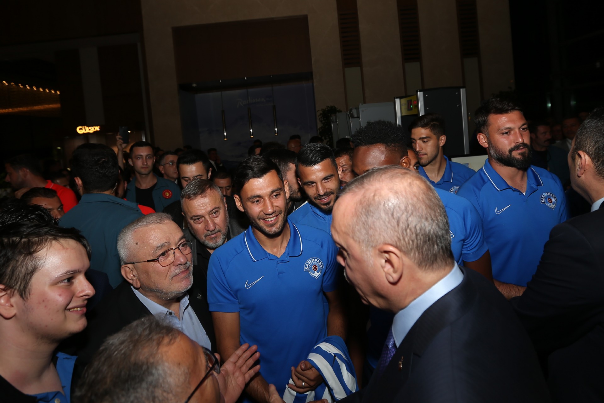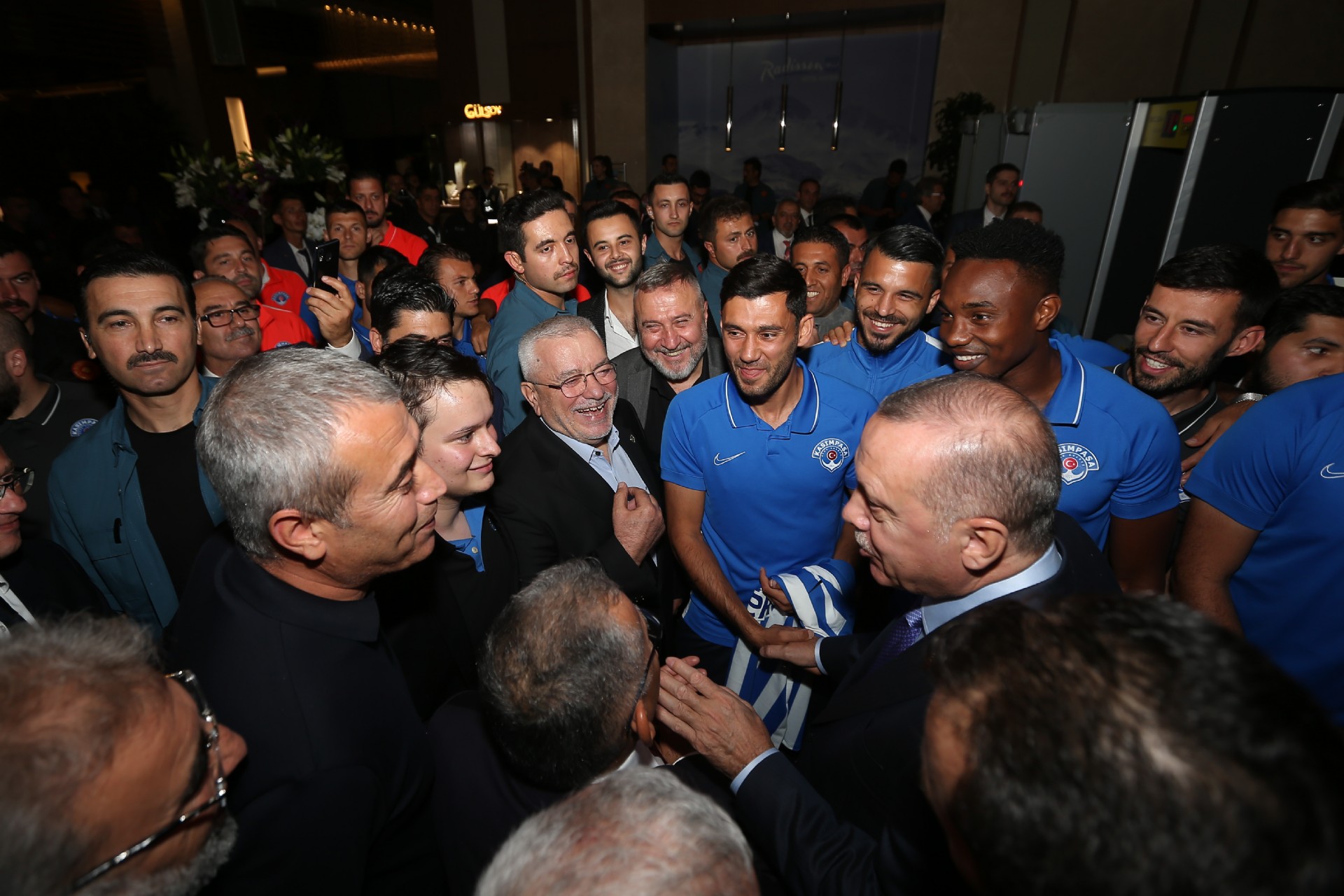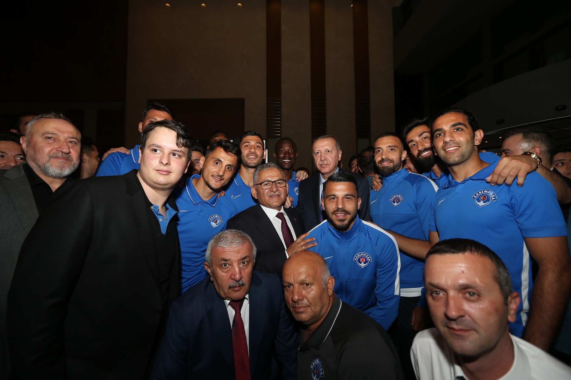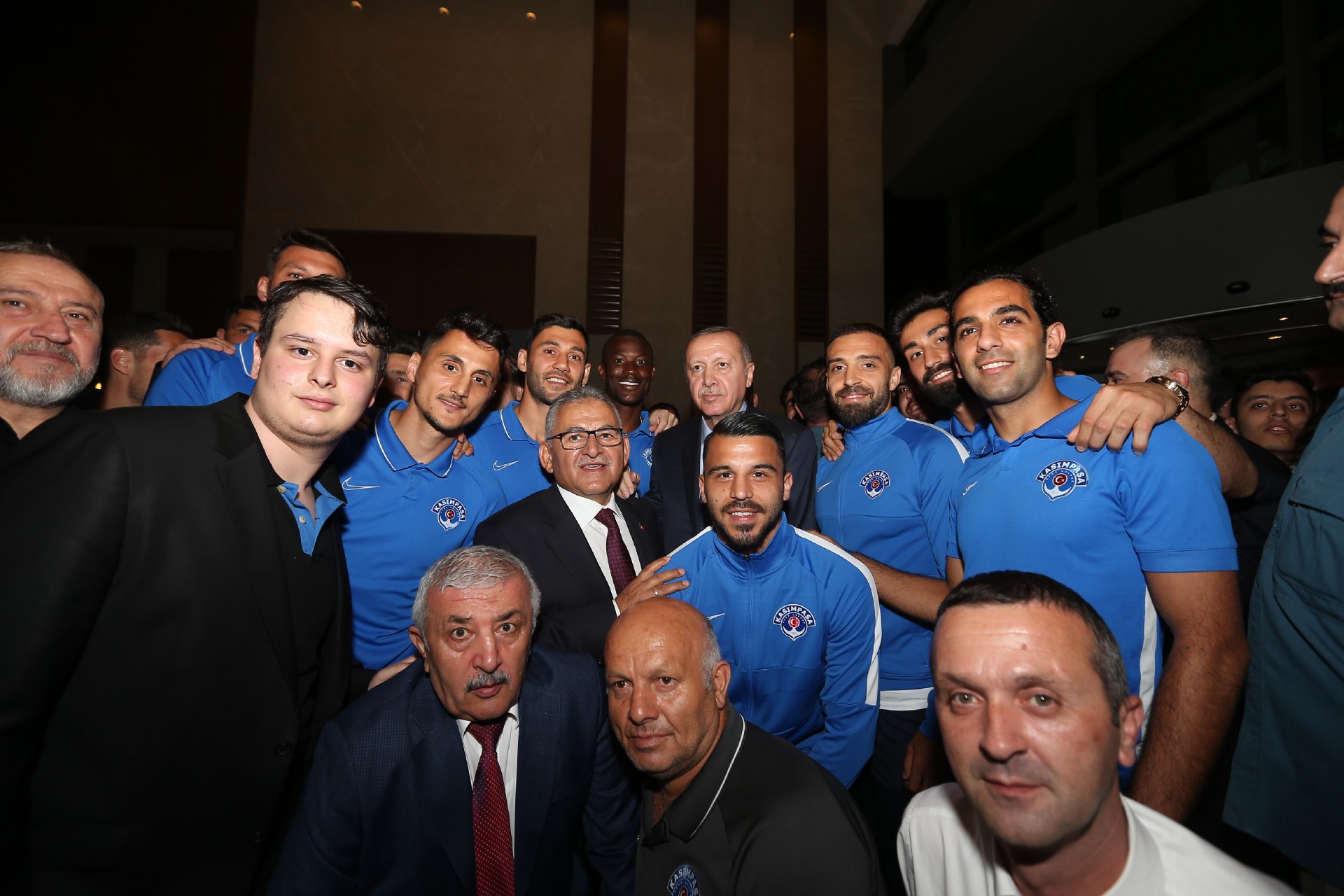 Cumhurbaşkanı Recep Tayyip Erdoğan, Kayserispor maçı için kentte bulunan Kasımpaşalı futbolcularla bir araya geldi. Başkan Erdoğan, Kasımpaşa yönetimi, teknik heyeti ve futbolcular ile sohbet etti. Gerçekleşen sohbetin ardından futbolcular, 53 numaralı forma hediye ettikleri Recep Tayyip Erdoğan'la fotoğraf çektirdiler. İşte o anlardan kareler...