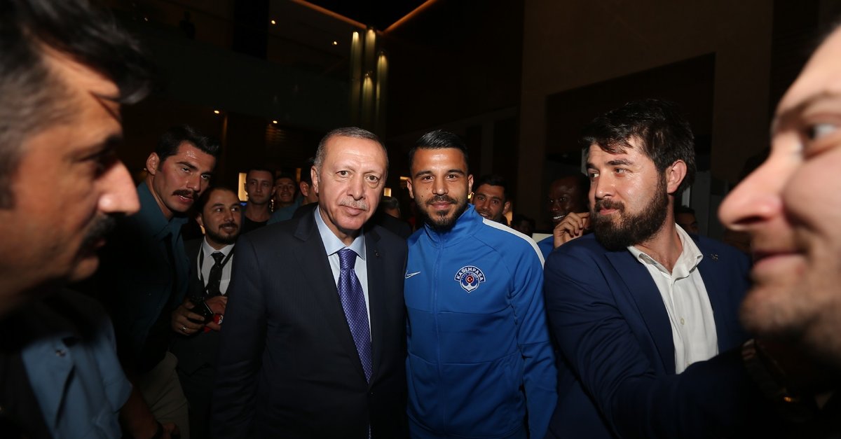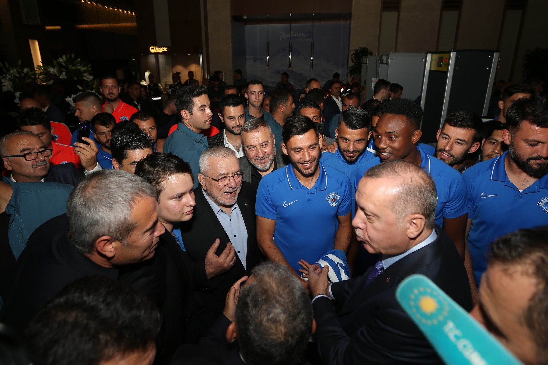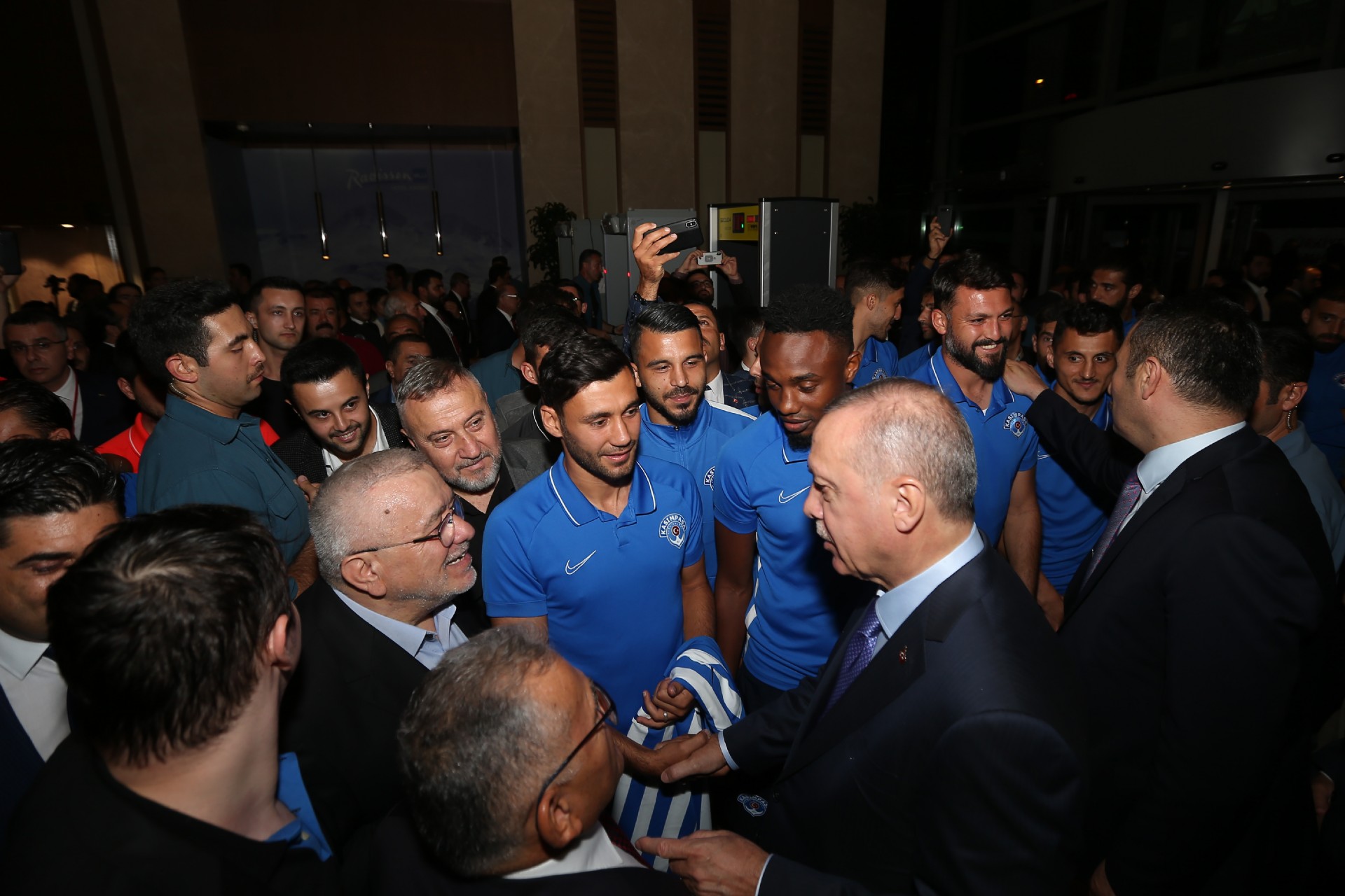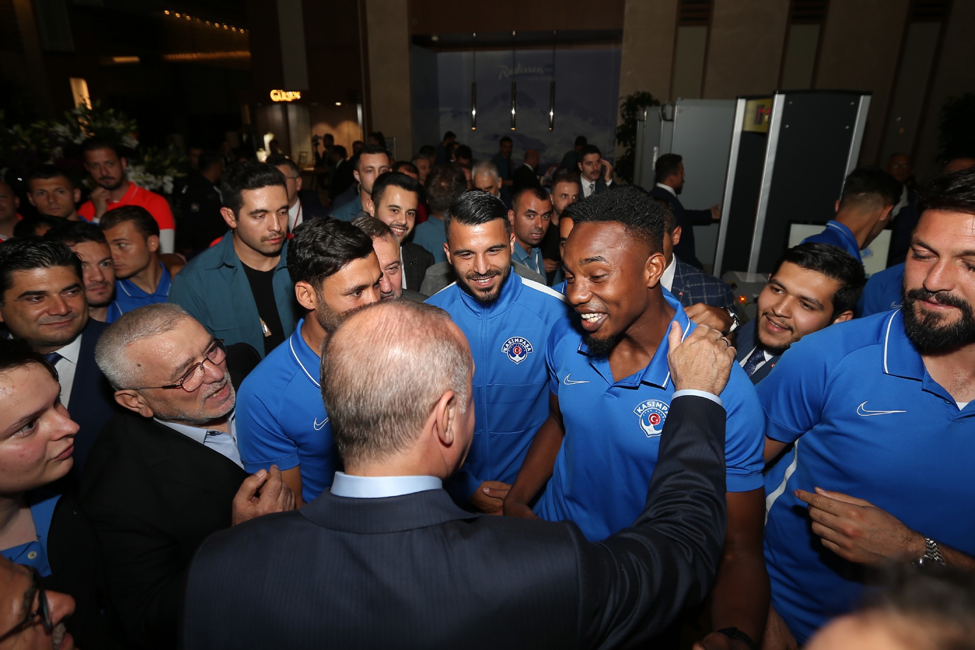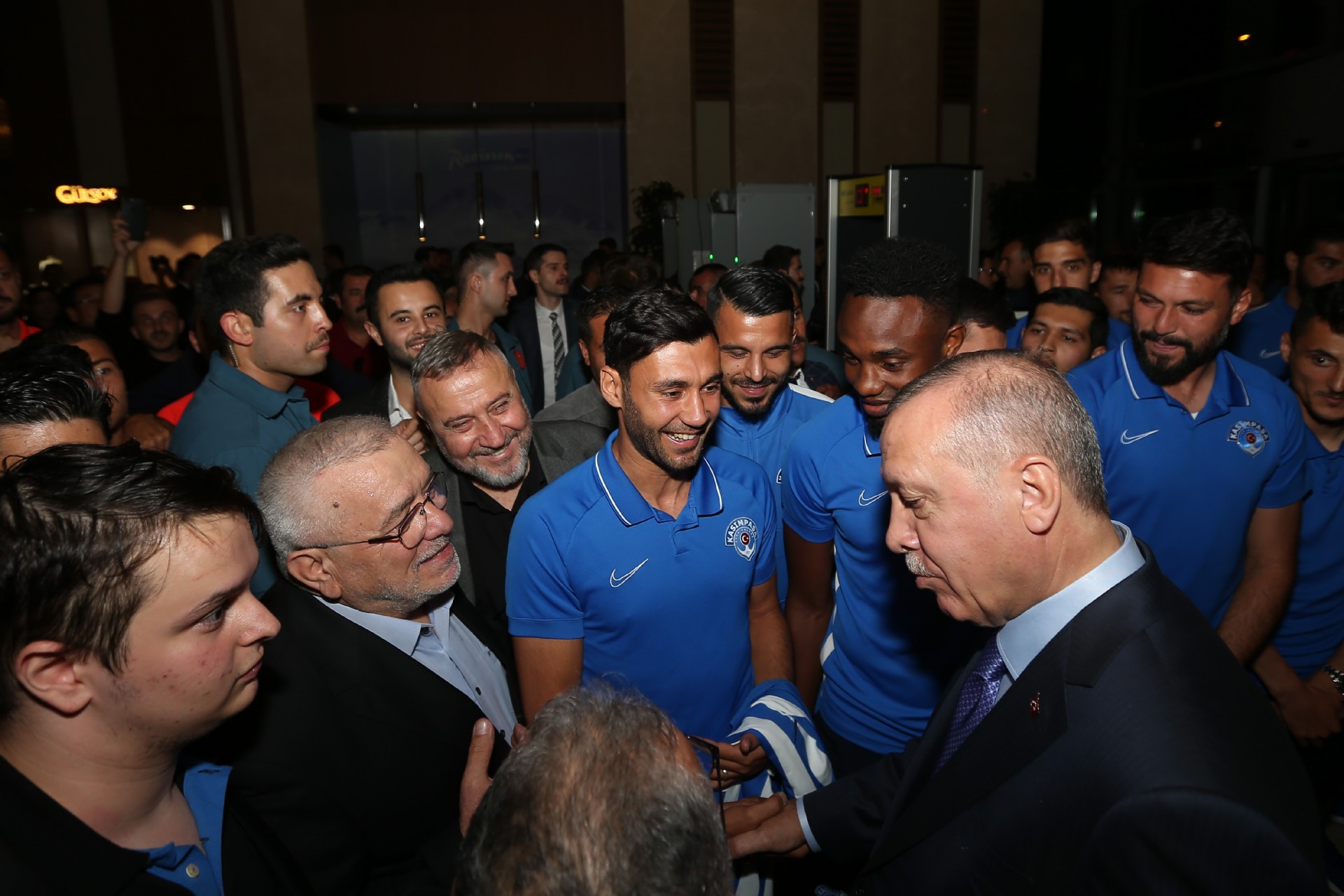 Cumhurbaşkanı Recep Tayyip Erdoğan, Kayserispor maçı için kentte bulunan Kasımpaşalı futbolcularla bir araya geldi. Başkan Erdoğan, Kasımpaşa yönetimi, teknik heyeti ve futbolcular ile sohbet etti. Gerçekleşen sohbetin ardından futbolcular, 53 numaralı forma hediye ettikleri Recep Tayyip Erdoğan'la fotoğraf çektirdiler. İşte o anlardan kareler...