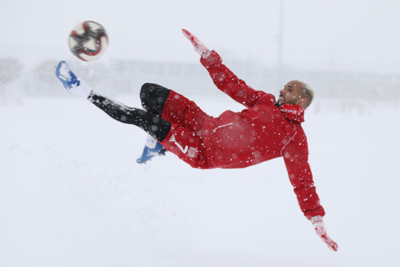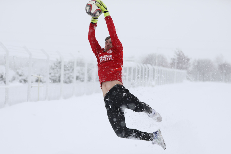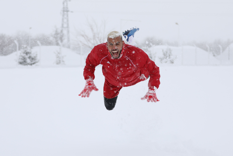Süper Lig'in lideri Demir Grup Sivasspor'da futbolcular kar yağışı sonrası kulüp tesislerindeki antrenman sahalarında 50 santimetreyi bulan kar birikintisinde doyasıya eğlendi.