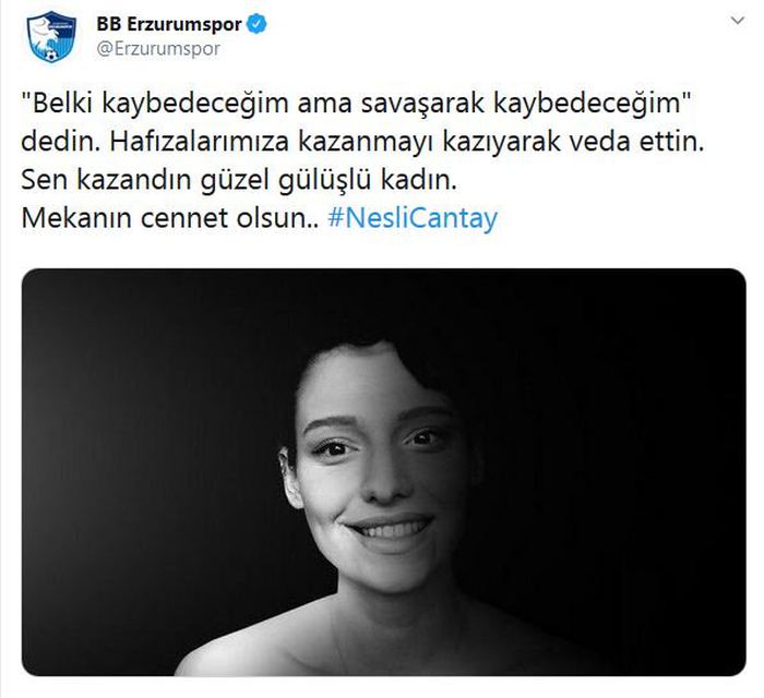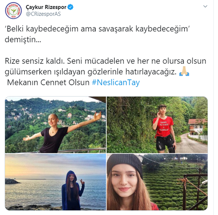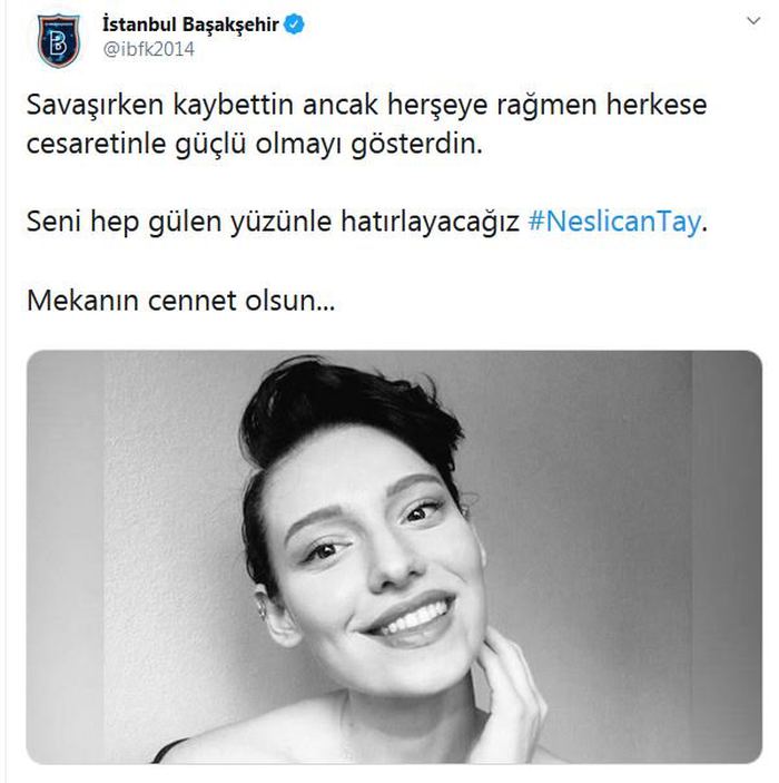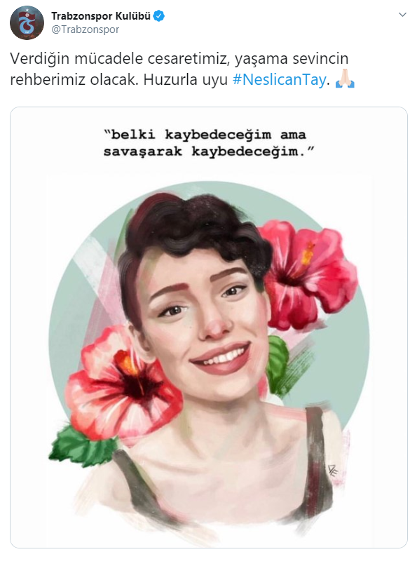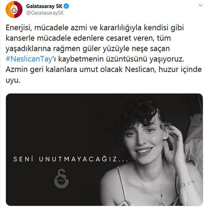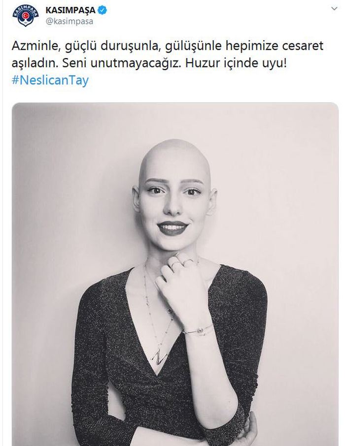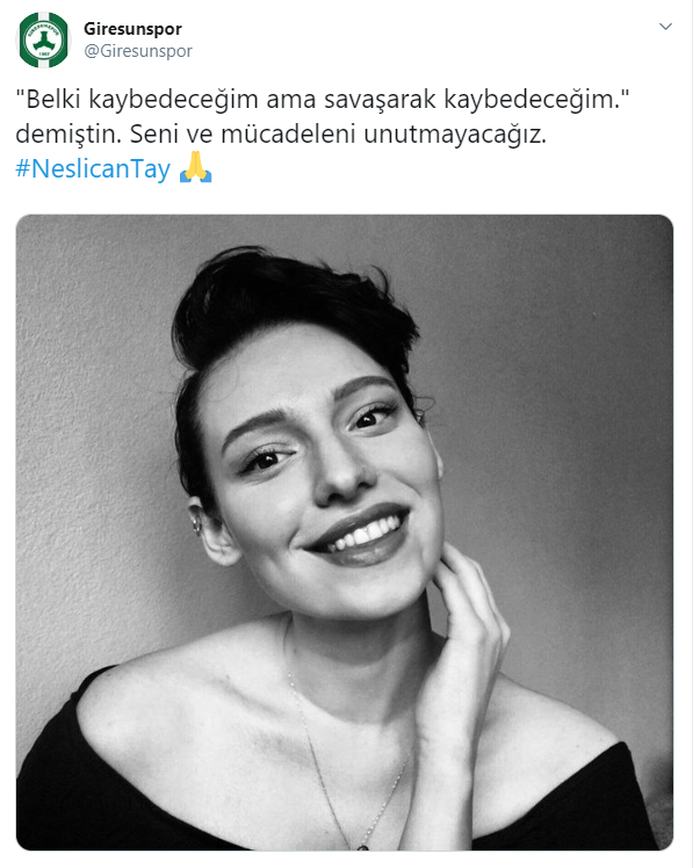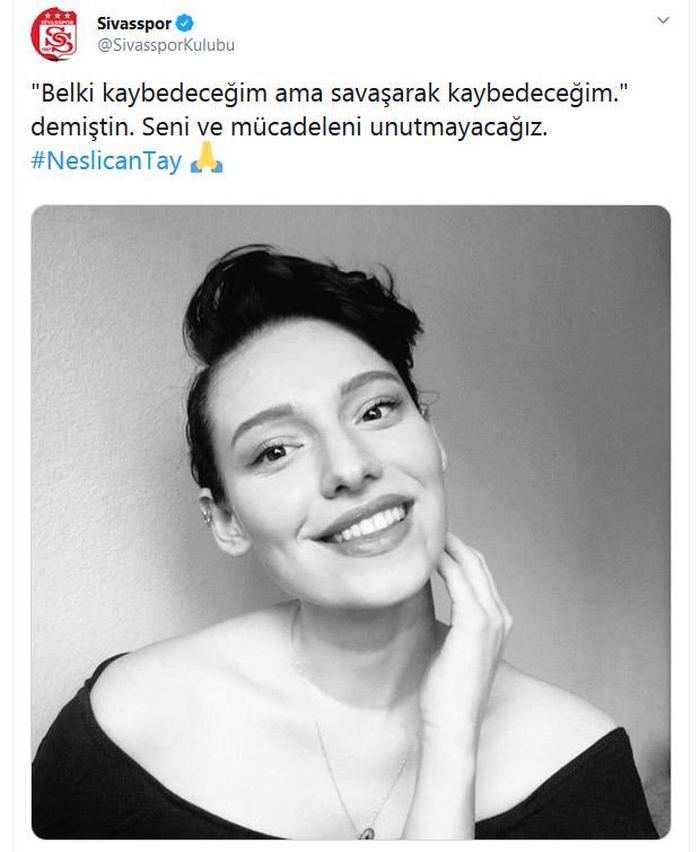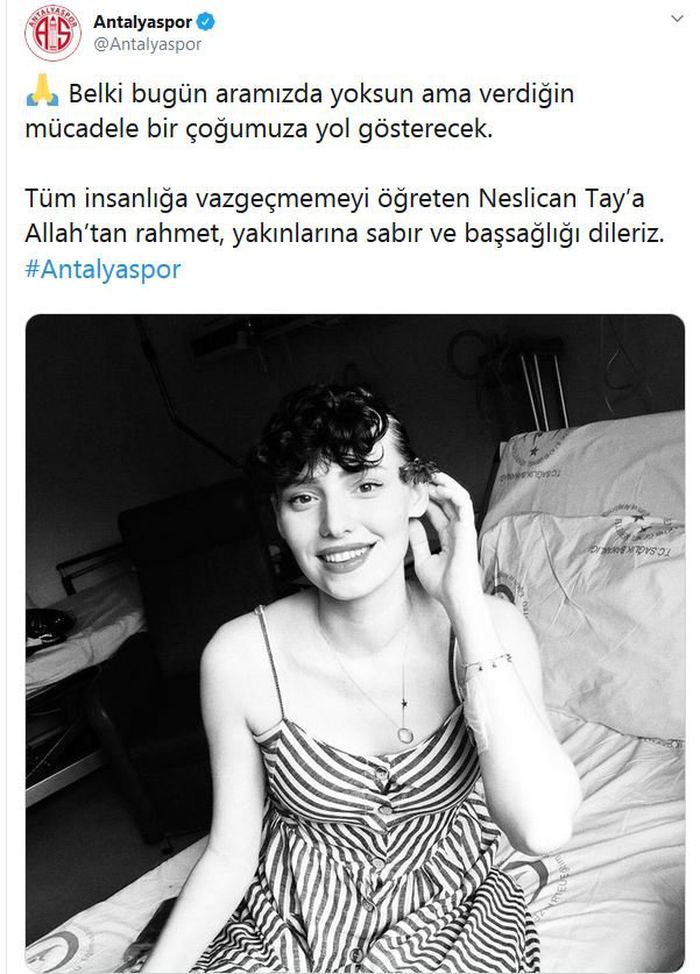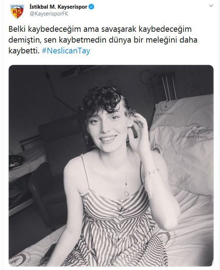 Sosyal medyada, bir bacağının kesilmesine neden olan kansere karşı verdiği mücadeleyle tanınan 20 yaşındaki Neslican Tay, bir süredir İstanbul'daki özel bir hastanede yoğun bakımda bulunuyordu. Neslican Tay tedavi gördüğü hastanede hayatını kaybetti. Neslican'ın vefat haberi spor camiasında da üzüntüyle karşılandı. Gençlik ve Spor Bakanı Mehmet Muharrem Kasapoğlu başta olmak üzere Süper Lig ekipleri Neslican için taziye mesajı yayınlandı. İşte o mesajlar...