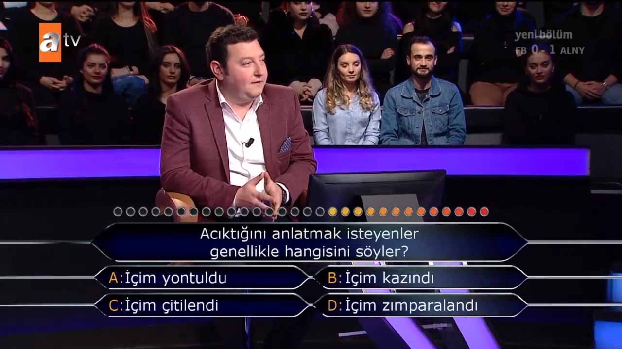 Kenan İmirzalıoğlu'nun başarılı sunumuyla atv ekranlarında yayınlanan Kim Milyoner Olmak İster'in 8 Şubat 2020 tarihinde yayınlanan 865. yeni bölümü yine izleyiciler tarafından merakla takip edildi. Dünya televizyonlarının en çok izlenen yarışma programı Kim Milyoner Olmak İster'in 865. yeni bölümüne 'Futbol ' sorusu geceye damga vurdu. İşte Kim Milyoner Olmak İster'in son bölümünde yer alan sorular ve stüdyodaki yarışmacıların o sorulara verdikleri cevaplar...