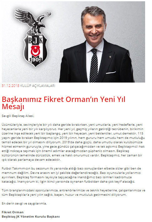 Türkiye Basketbol Federasyonu Başkanı Hidayet Türkoğlu: "Yeni yılın tüm dünyaya barış, mutluluk ve huzur getirmesini temenni ederken, Türkiye Basketbol Federasyonu olarak Türk basketbolunu daha da üst noktalara taşımak için 2018'de olduğu gibi 2019'da da kararlılıkla çalışmaya devam edeceğimizi belirtmek isterim. Bu düşüncelerle yeni yılınızı kutlar, herkese spor ve sağlık dolu iyi bir yıl dilerim."