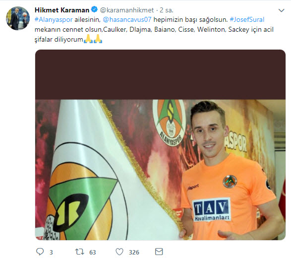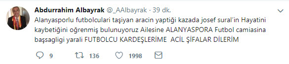 Alanyasporlu Josef Sural, Kayserispor deplasmanından dönerken geçirdiği trafik kazasında hayatını kaybetti. Futbol dünyası bu acı haberin ardından Josef Sural için kulübü ve ailesine başsağlığı mesajları yayınladı. İşte o mesajlar...