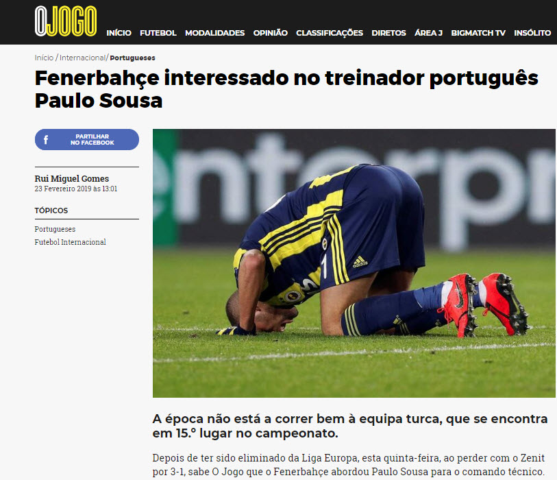 Portekiz O Jogo Gazetesi'nde çıkan habere göre Fenerbahçe'nin Portekizli teknik adam Paulo Sousa ile ilgilendiği ifade edildi.