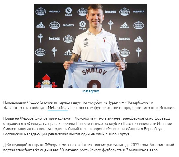 Smolov'un şu anda bonservisi Lokomotiv'de. Ancak ara transferde Celta'ya kiralandı. Bu sezon Real Madrid'e karşı 1 gol attı."