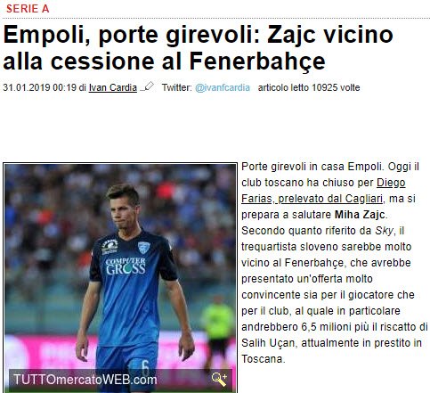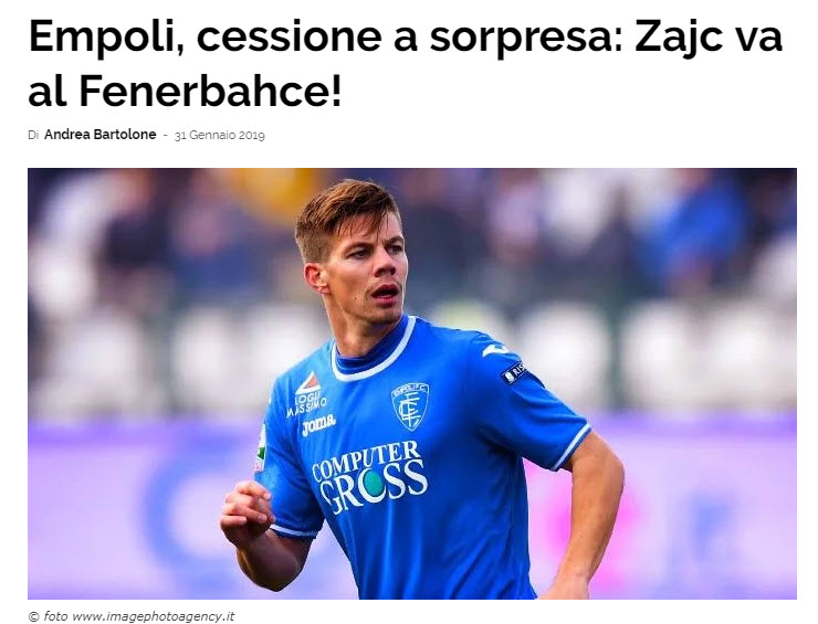 Öte yandan, Sky Sports, gelişmeyle ilgili yayınladığı haberde "Empoli ikinci devreyi Zajc'ten yoksun sürdürmek zorunda kalacak zira Fenerbahçe, 24 yaşındaki oyuncu için geri çevirmesi zor bir teklif yaptı" ifadelerini kullandı.
