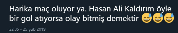 Spor Toto Süper Lig'in 23. haftasında oynanan Beşiktaş - Fenerbahçe derbisinde Hasan Ali Kaldırım'ın uzak mesafeden attığı ve skoru 3-3'e getiren gol sonrası sosyal medyada yorumlar patladı.