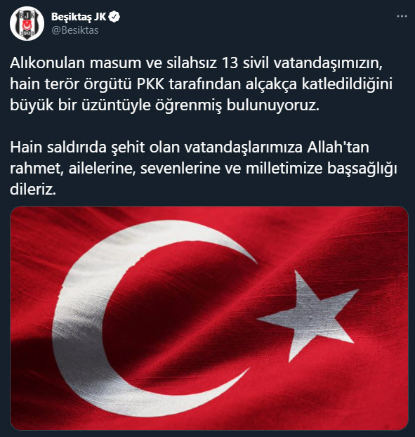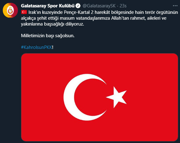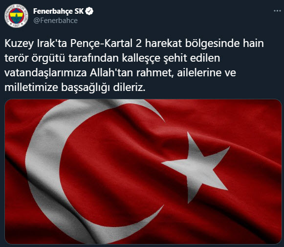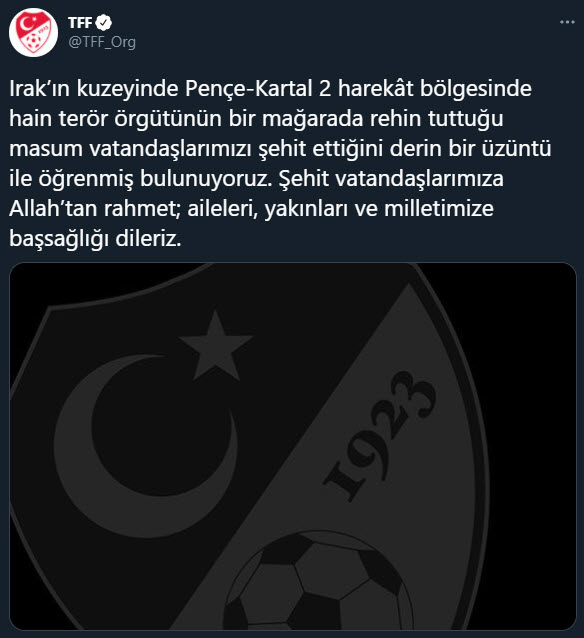 TFF: Irak'ın kuzeyinde Pençe-Kartal 2 Harekat bölgesinde hain terör örgütünün bir mağarada rehin tuttuğu masum vatandaşlarımızı alçakça bir saldırıyla şehit ettiğini derin bir üzüntü ile öğrenmiş bulunuyoruz. Şehit vatandaşlarımıza Allah'tan rahmet, aileleri, yakınları ve milletimize başsağlığı dileriz.