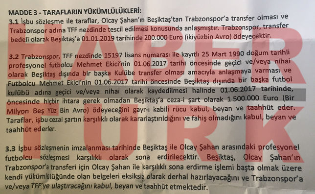Siyah-Beyazlılar'dan Olcay Şahan'ın Trabzonspor'a sadece 200 bin Euro'ya gerçekleşen transferi sırasında imzalanan bu sözleşmede cezai hükme de yer verilirken, " Trabzonspor, Mehmet Ekici'nin 01.06.2017 tarihi öncesinde Beşiktaş dışında başka bir kulübe gitmesi halinde Beşiktaş'a cezai şart olarak 1 milyon 500 bin Euro ceza ödeyeceğini kabul, beyan ve taahhüt eder" maddesi koyuldu. Fenerbahçe o süreçte 2 milyon Euro bonservis bedelini gözden çıkartmasına karşın, Trabzonspor yönetimi olumsuz yanıt vermişti. Ekici, Fener'e gitmekte ısrar edince Trabzonspor tarafından kadro dışı bırakılmıştı.