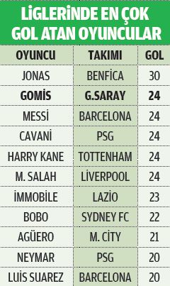 Geride kalan 24 haftada 24 gole imza atan Gomis sadece 30 gol kaydeden Benfica'nın yıldızı Jonas'ı geçemedi.