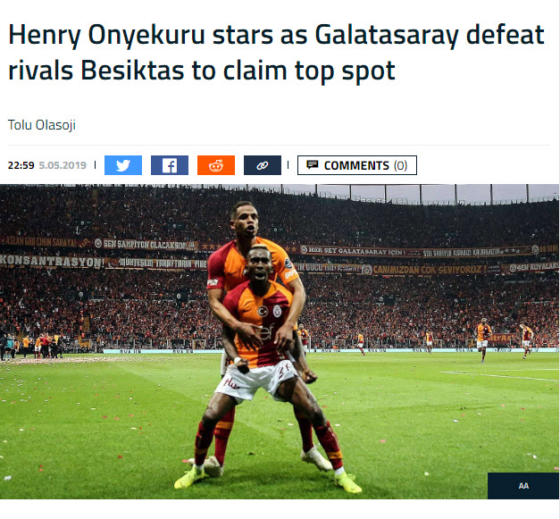 Maç haberinde "Süper Kartallar'ın forveti Henry Onyekuru, Beşiktaş derbisinde attığı golle takımını ateşledi, bitime 8 dakika kala sarı kart görünce Fatih Terim tarafından Martin Linnes'le değiştirildi" ifadeleri yer aldı.