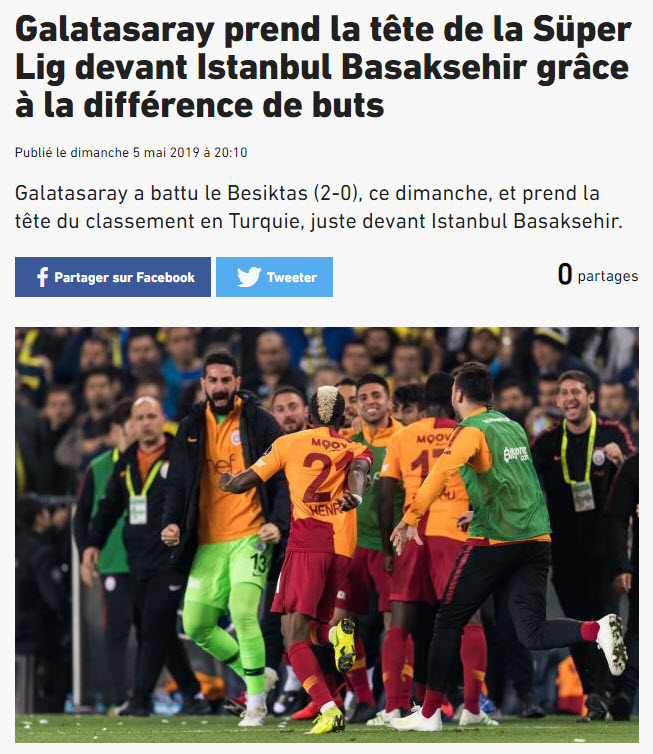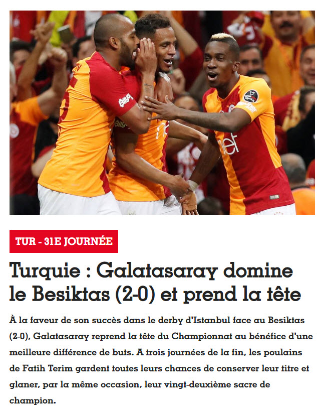 Bir diğer Fransız gazetesi L'Equipe ise Galatasaray'ın derbi mücadelesinde Onyekuru'nun golü sonrası daha güçlü bir oyun oynadığını ve Fernando'nun golüyle de geceye nokta koyduğunu ifade ederken "Galatasaray zirveyi ele geçirme fırsatını geri çevirmedi" sözlerini kullandı.
