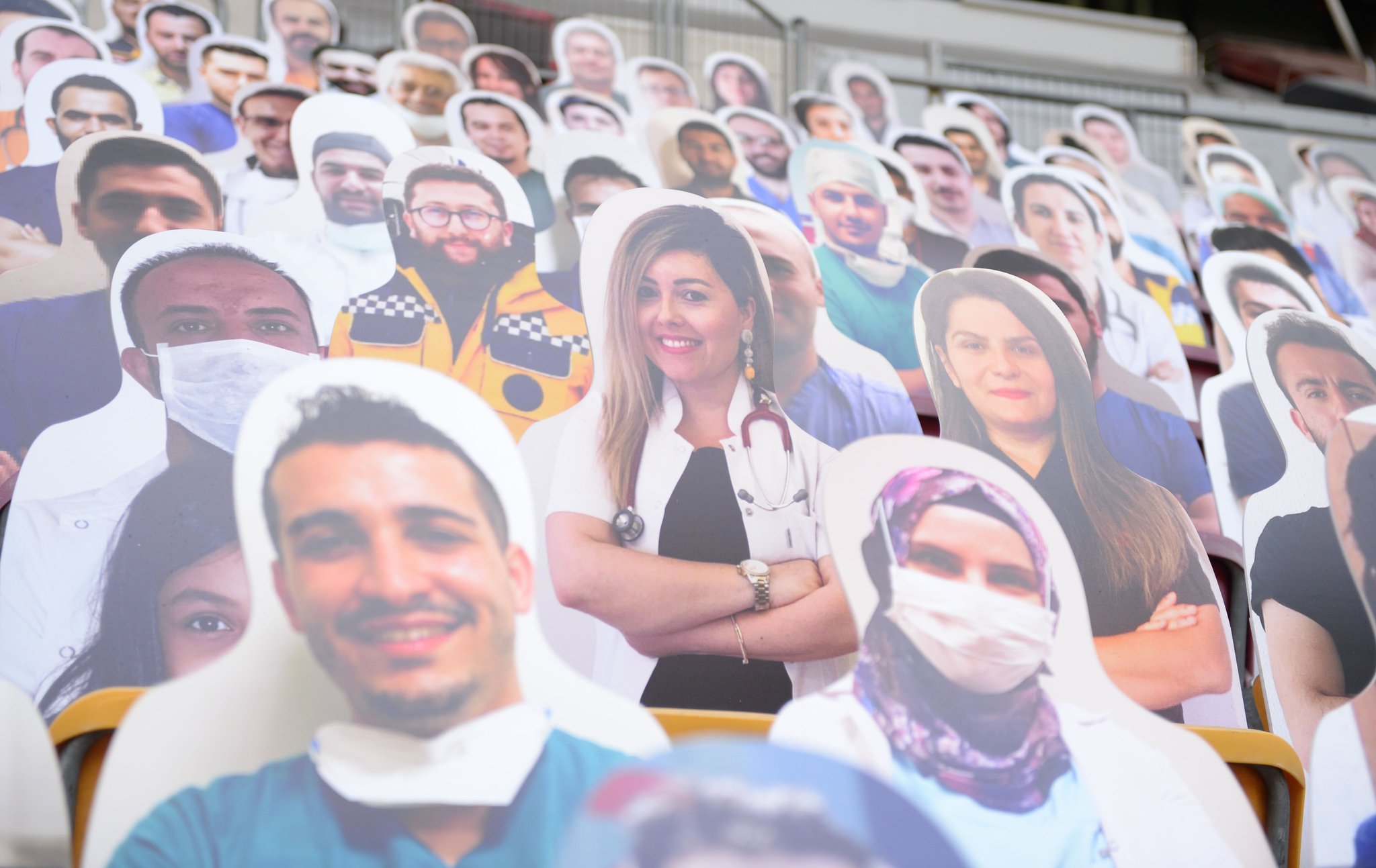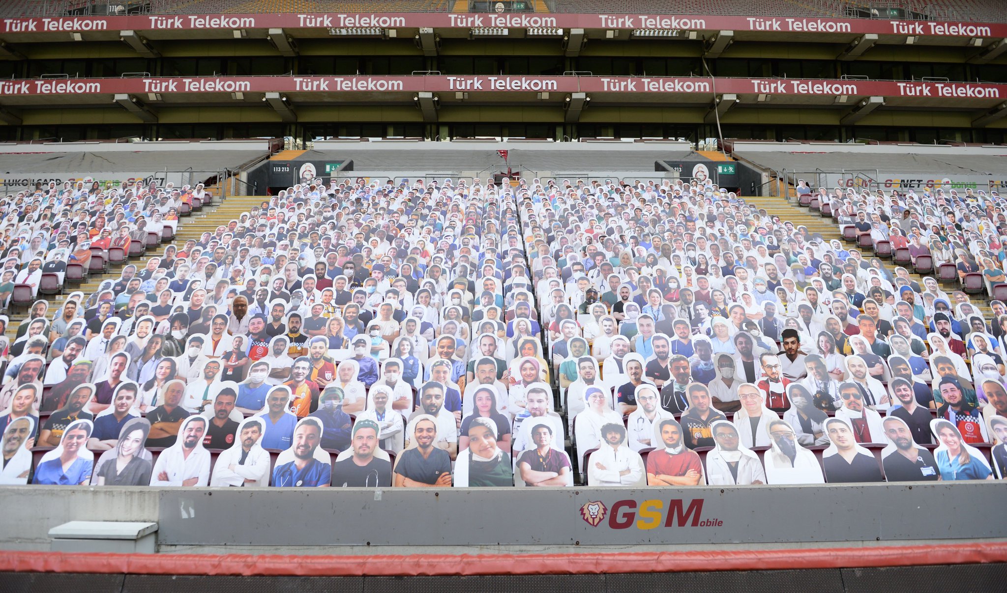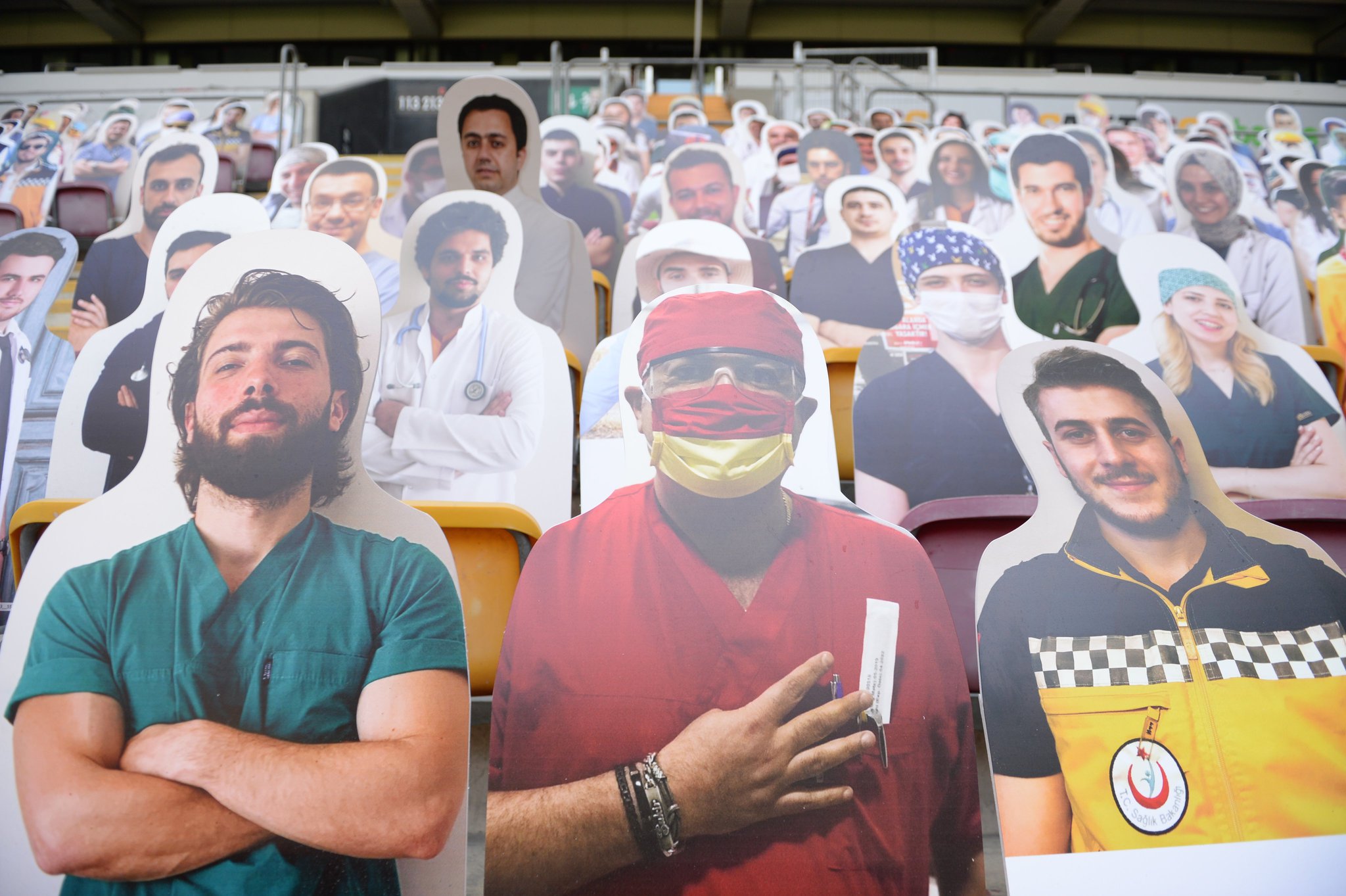 Yeni tip corona virüsü (Covid-19) salgını nedeniyle Süper Lig'in seyircisiz oynanmaya devam edilmesi kararının alınmasından sonra, Galatasaray "Sensiz Olmaz Galatasaray" kampanyası başlatmıştı. Sarı-kırmızılılar, bu kampanyayı düzenlerken sağlık çalışanlarını unutmadı ve 1905 sağlık çalışanının kartonlarını tribünlere yerleştirdi. İşte o fotoğraflar...