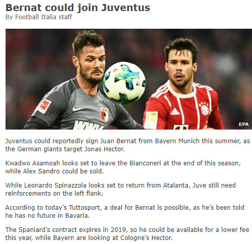 İtalyan basınından Galatasaray'ı üzecek flaş bir iddia ortaya atıldı İddiaya göre Galatasaray'ın ilgilendiği Bernat'a, Juventus talip oldu Tuttosport'ta çıkan haberde, Juventus İspanyol sol beke resmen talip oldu Habere göre, Asamoah'ın takımdan ayrılacak olması ve Sandro'nun da satılma ihtimalinin olması, Juventus'u yeni bir sol bek arayışına itti Bernat'ın Bayern Münih'le 1 yıllık daha kontratı bulunuyor Yaz transfer döneminde kadrosuna bir sol bek katmayı planlayan Galatasaray'ın, Juan Bernat ile ilgilendiği yazılmıştı