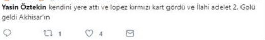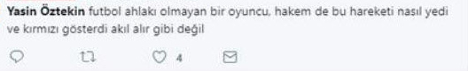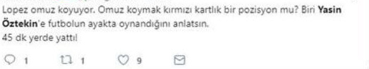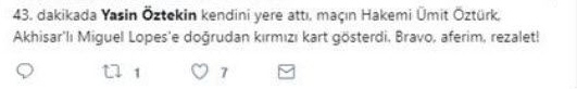Galatasaray'da Yasin Öztekin'in omuz omuza giden pozisyonda kendini yere bırakması sonrasında hakem Ümit Öztürk, Miguel Lopes'e kırmızı kart gösterdi. Bu pozisyon sonrasında Öztekin'e sosyal medya üzerinden büyük tepki oluştu.