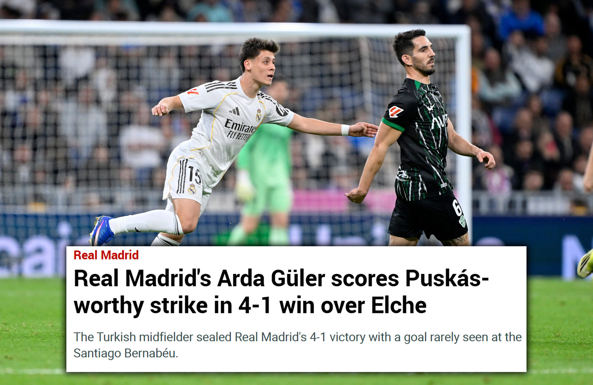 "Real Madrid'in yıldız oyuncusu Arda Güler sihirli değneğini salladı ve stadyum adeta bir trans haline girdi. Hiç de şaşırtıcı değil; dahi Türk'ün Elche'ye karşı attığı o muhteşem gol, taraftarların nesilde bir kez şahit olabileceği türden bir goldü. Güler'in muhteşem golü şimdiden bir sonraki Puskas Ödülü için ciddi bir aday gibi görünüyor. Bir başyapıtın tüm unsurlarına sahip."