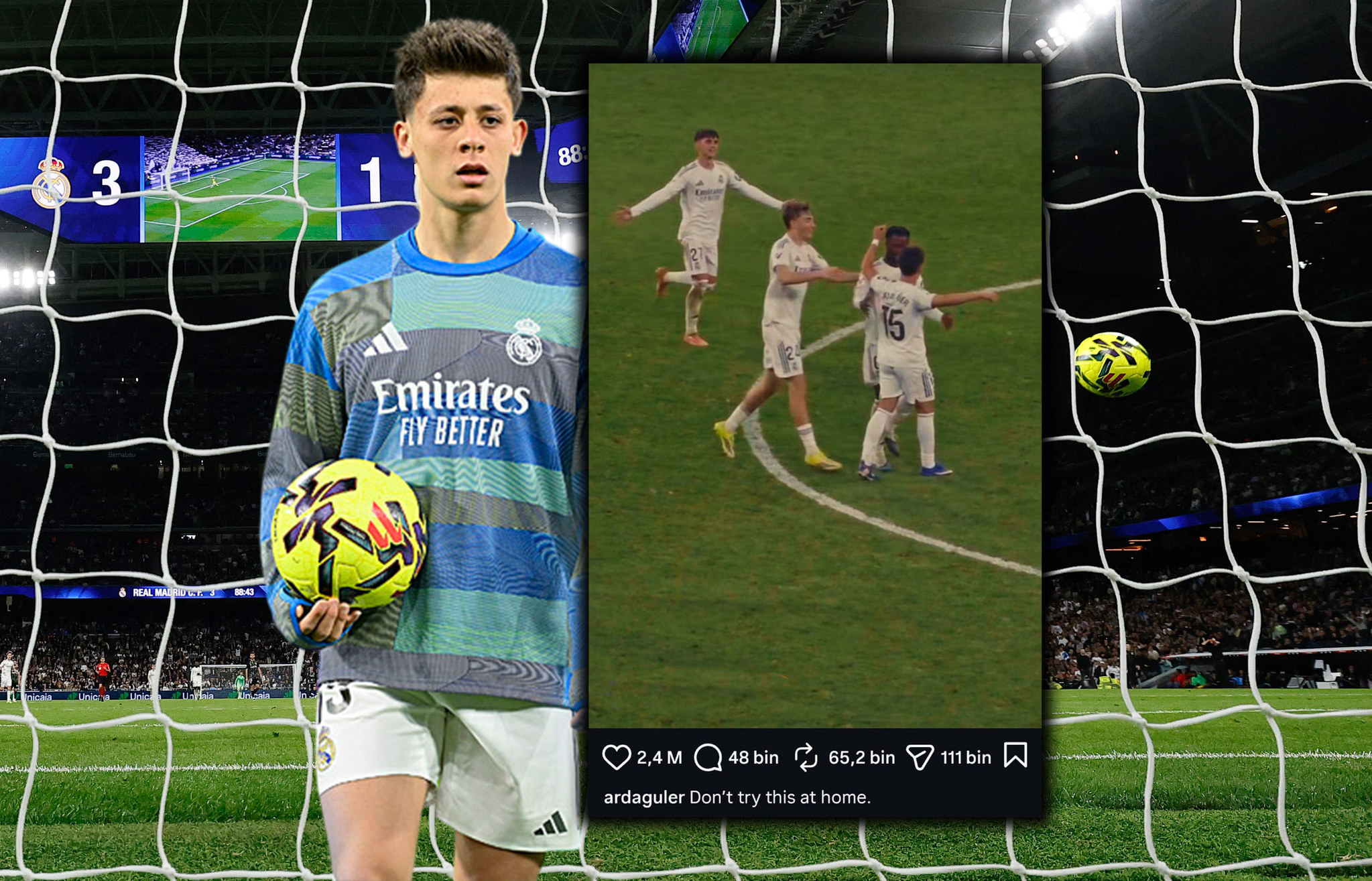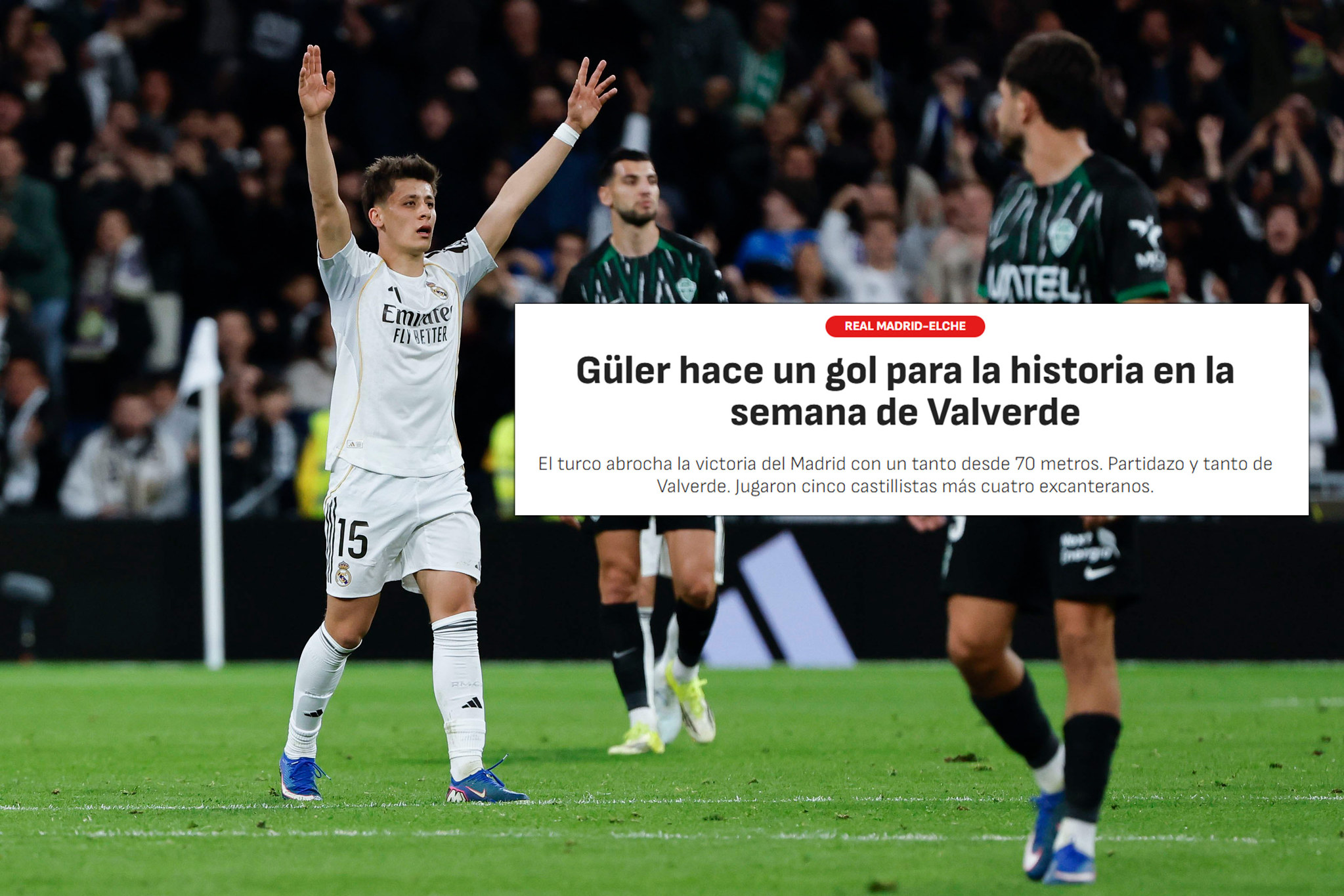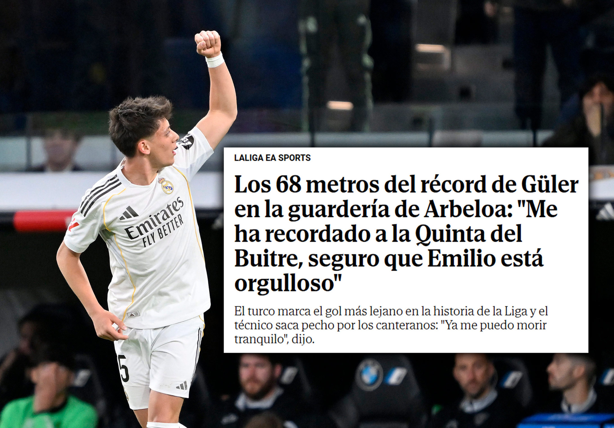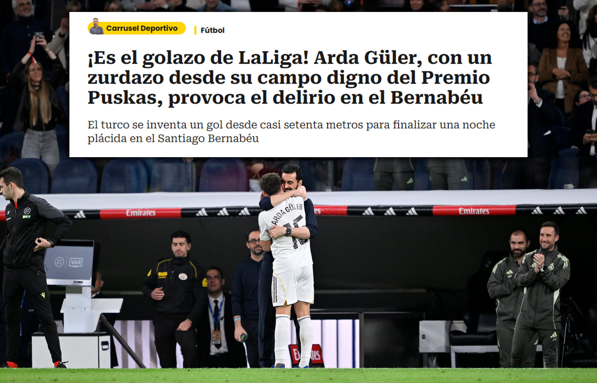 "Muhtemelen sezonun en iyi golü. Santiago Bernabeu'da geceyi bitirmenin daha iyi bir yolunu hayal etmek zor. Arda Güler, yıllarca hatırlanacak gollerden birini attı. Anne babaların çocuklarına anlatacağı türden bir gol. Yaklaşık 65 metreden, kendi yarı sahasından 11 metre uzaklıktan orta saha çizgisinin gerisinden bir vuruş. La Liga tarihinin en uzun mesafeli gollerinden biri."