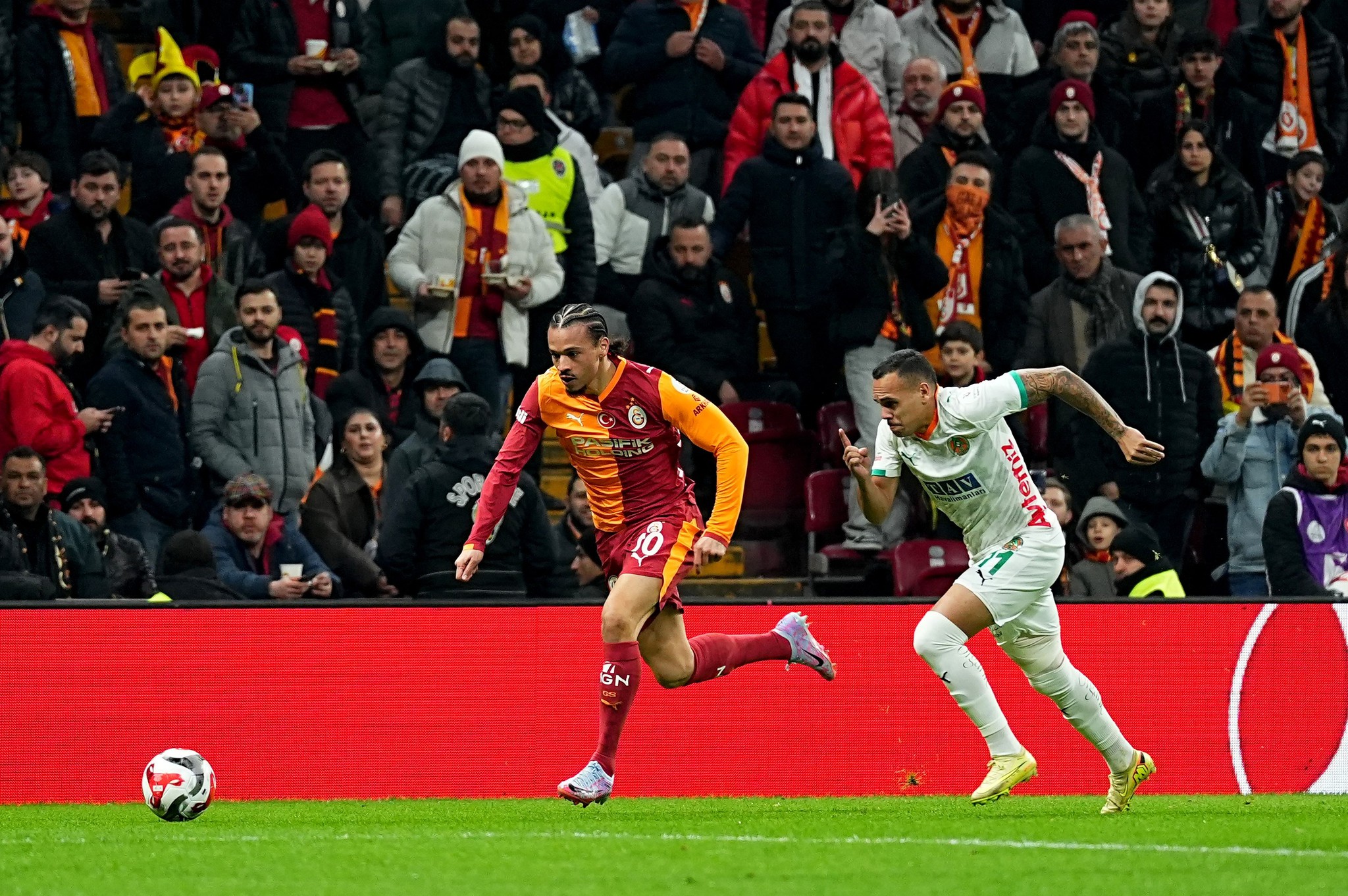 Alanyaspor dün de Galatasaray karşısında aynı futbolu oynamaya çalıştı. Galatasaray baskısı karşısında üçlü savunma hattı hemen beşliye döndü. İlk yarıda aslında çok da iyi direndiler. Ama ilk yarının uzatma anlarında Boey, cetvelvari bir vuruşla topu kalecinin uzanamayacağı köşeye bıraktı. Asist Torreira'dan geldi. Boey'in ilk 45'te bir golü de ofsaytta takıldı. Maçta ön plana çıkan oyunculardan biri de Sane idi. Derinlemesine çok güzel paslar attı, etkili bindirmeler yaptı Sane! İlk yarıda Alanyaspor'un sol kanadı, Galatasaray'ın da sağ kanadı çok iyi işledi.