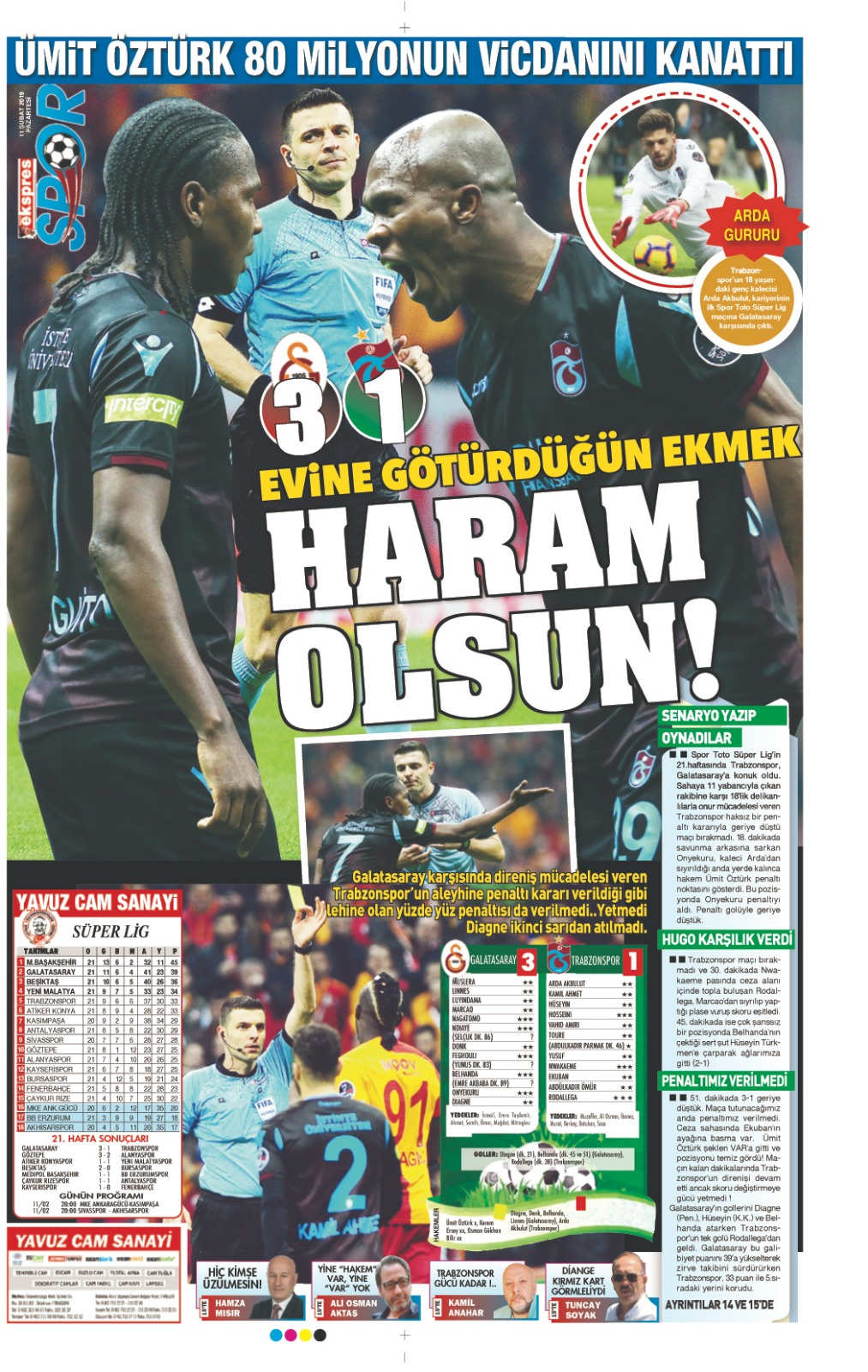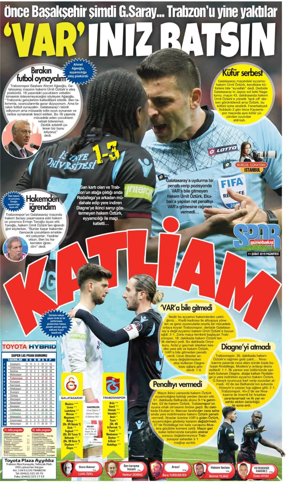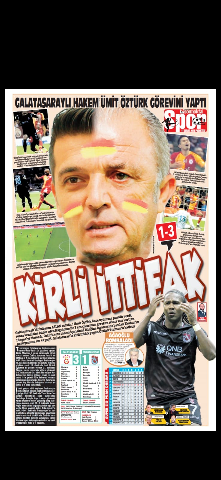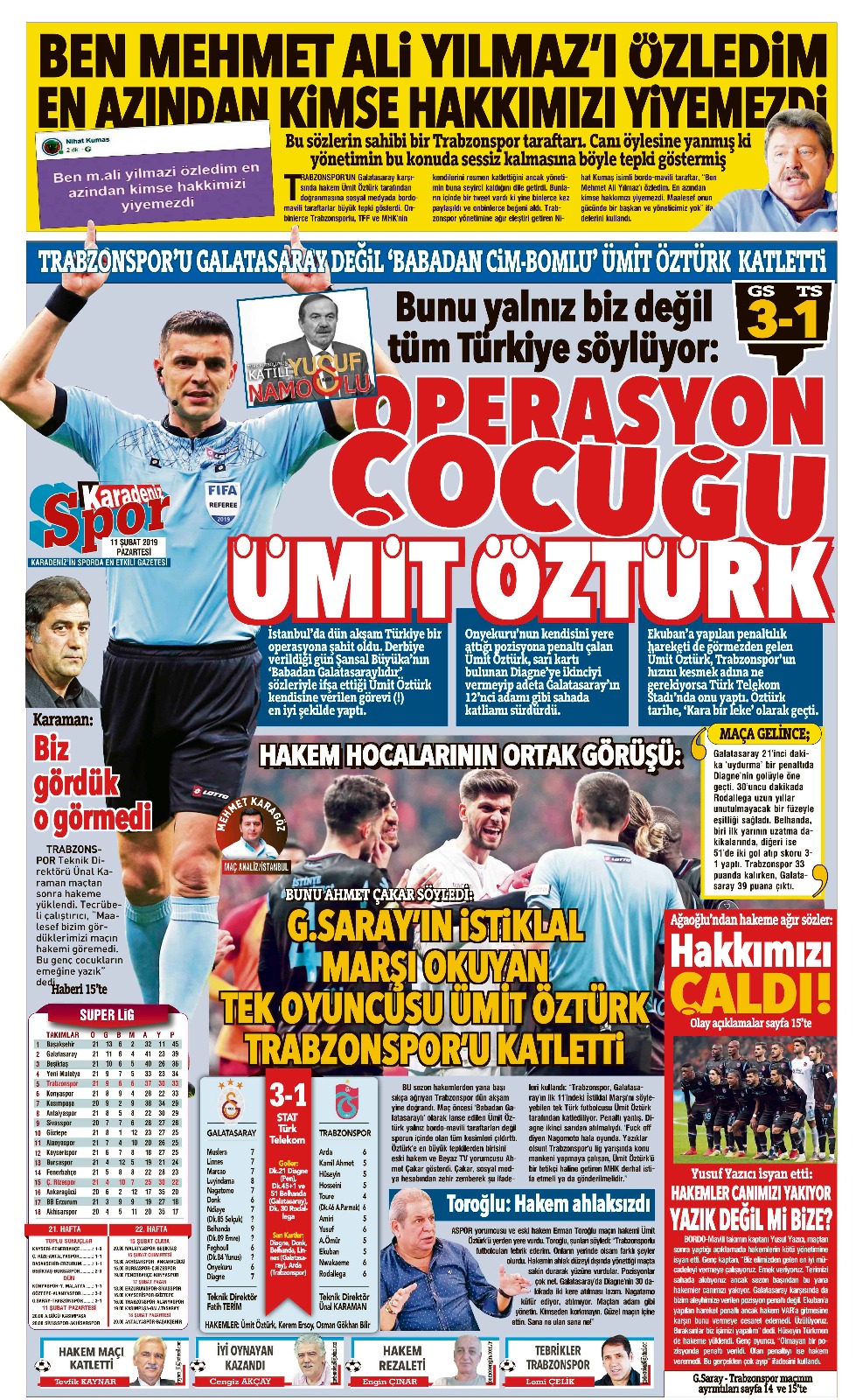 Galatasaray ile Trabzonspor arasında oynanan mücadelde hakem Ümit Öztürk'ün kararları tartışma yarattı. Oynadığı son 3 maçın ardından da hakem hataları tartışılırken, yerel gazeteler Galatasaray maçının ardından hakem Ümit Öztürk'ü eleştirdi ve 'Trabzon'u yaktılar, katlettiler' başlıklarıyla tepki gösterdi.