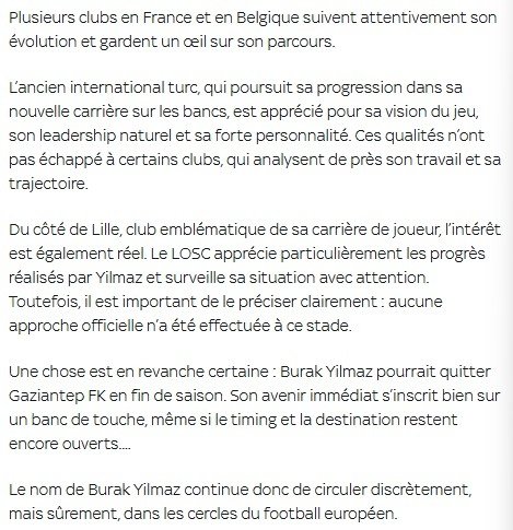 Sacha Tavolieri'nin haberine göre Fransa ve Belçika'daki birçok kulüp, onun gelişimini yakından takip ediyor ve kariyer yolculuğunu dikkatle izliyor. Şu anda herhangi bir resmi temasın gerçekleşmediği ifade edilen haberde, Burak Yılmaz'ın sezon sonunda Gaziantep FK'den ayrılabileceği söz edildi.,
