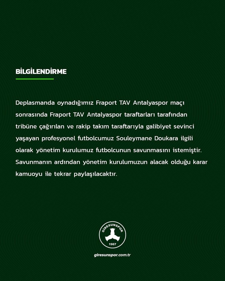 Karadeniz ekibi, olayla ilgili açıklamada bulundu. Doukara'nın savunmasının alınacağı kaydedildi.