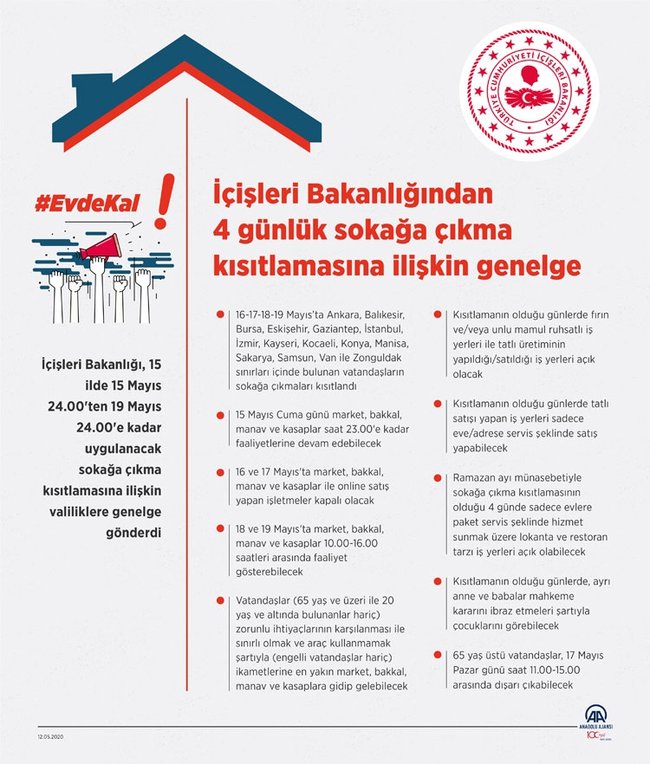 Ankara, Balıkesir, Bursa, Eskişehir, Gaziantep, İstanbul, İzmir, Kayseri, Kocaeli, Konya, Manisa, Sakarya, Samsun, Van ve Zonguldak olmak üzere toplam 15 ilde, 15 Mayıs Cuma günü saat 24.00 ile 19 Mayıs Salı günü saat 24.00'da sokağa çıkma kısıtlaması uygulanacak. Aydın, Denizli, Şanlıurfa, Antalya, Erzurum, Hatay, Malatya, Mersin ve Muğla illerinde sokağa çıkma yasağı kaldırıldı