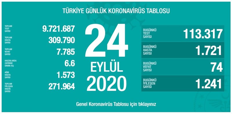 Bakan Koca, 'Türkiye Günlük Koronavirüs Tablosu'nu açıkladı. Tabloya göre 24 Eylül tarihinde yapılan 113 bin 317 corona virüsü testinden 1.721'i pozitif çıktı, 74 kişi hayatını kaybetti, 1.241 hasta da iyileşerek taburcu edildi. Tabloda bugüne kadar yapılan toplam test sayısı 9 milyon 721 bin 687, toplam vaka sayısı 309 bin 790, toplam vefat sayısı 7 bin 785, ağır hasta sayısı 1.573, hastalarda zatürre oranı %6.6, toplam iyileşen hasta sayısı 271 bin 964 oldu.