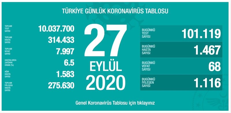 27 Eylül Pazar günü 101 bin 119 test yapıldı. Bu testlerde 1.467 vakaya rastlandı. 68 vatandaşımız hayatını kaybederken, 1.116 vatandaşımız sağlığına kavuştu. Tabloya göre, toplam test sayısı 10 milyon 37 bin 700, toplam vaka sayısı 314 bin 433, toplam vefat sayısı 7 bin 997, toplam ağır hasta sayısı 1.583, hastalarda zatürre oranı %6.5, toplam iyileşen hasta sayısı 275 bin 630 oldu.
