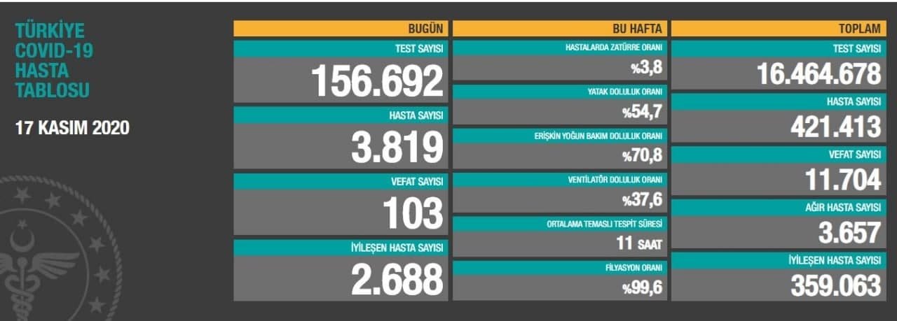 Sağlık Bakanı Fahrettin Koca, sosyal medya hesabından 'Türkiye Günlük Koronavirüs Tablosu'nu açıkladı. Tabloya göre 17 Kasım tarihinde yapılan 156 bin 692 corona virüsü testinden 3.819'sı pozitif çıktı, 103 kişi hayatını kaybetti, 2.688 hasta da iyileşti.