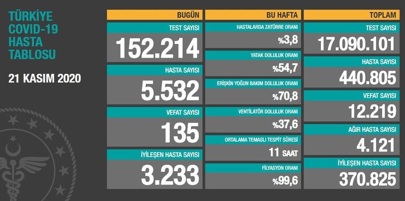 Sağlık Bakanı Fahrettin Koca, sosyal medya hesabından 'Türkiye Günlük Koronavirüs Tablosu'nu açıkladı. Tabloya göre 21 Kasım tarihinde yapılan 152 bin 214 corona virüsü testinden 5.532'si pozitif çıktı, 135 kişi hayatını kaybetti, 3.233 hasta da iyileşti.