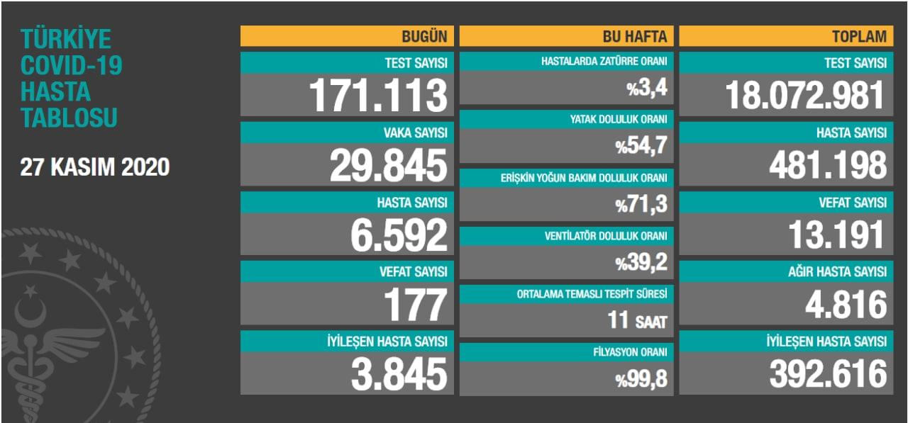 Bakan Koca, 'Türkiye Günlük Koronavirüs Tablosu'nu açıkladı. Tabloya göre 27 Kasım tarihinde yapılan 171 bin 113 corona virüsü testinden 6.592'si pozitif çıktı, 177 kişi hayatını kaybetti, 3.845 hasta iyileşti. Tablodaki toplam vaka sayısı ise 29.845 olarak açıklandı. Tabloda bugüne kadar yapılan toplam test sayısı 18 milyon 072 bin 981, toplam hasta sayısı 481 bin 198, toplam iyileşen hasta sayısı 392 bin 616, toplam vefat sayısı ise 13 bin 191 olarak yer aldı.