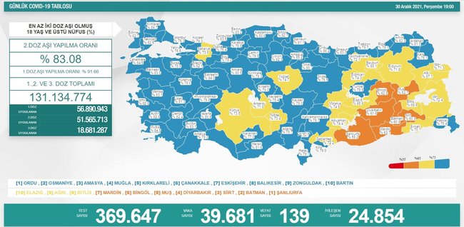 Sağlık Bakanı Fahrettin Koca, sosyal medya hesabından 'Türkiye Günlük Koronavirüs Tablosu'nu açıkladı. Tabloya göre 30 Aralık tarihinde yapılan 369 bin 647 corona virüsü testinde günlük vaka sayısı 39.681 olarak açıklanırken; 139 kişi hayatını kaybetti, 24.854 hasta da iyileşti.