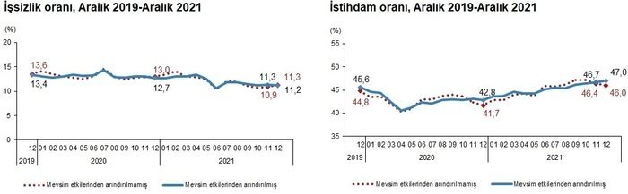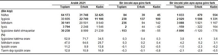 Türkiye genelinde 15 ve daha yukarı yaştaki kişilerde işsiz sayısı 2021 yılı Aralık ayında bir önceki aya göre 2 bin kişi artarak 3 milyon 794 bin kişi oldu. İşsizlik oranı ise 0,1 puanlık azalış ile %11,2 seviyesinde gerçekleşti.