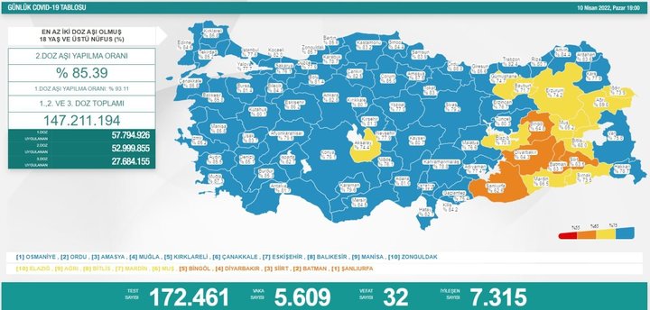 Sağlık Bakanı Fahrettin Koca, sosyal medya hesabından 'Türkiye Günlük Koronavirüs Tablosu'nu açıkladı. Tabloya göre 10 Nisan 2022 tarihinde yapılan 172 bin 461 corona virüsü testinde günlük vaka sayısı 5.609 olarak açıklanırken; 32 kişi hayatını kaybetti, 7.315 hasta da iyileşti.