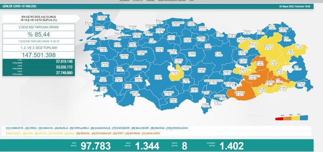 Sağlık Bakanı Fahrettin Koca, 'Türkiye Günlük Koronavirüs Tablosu'nu açıkladı. Tabloya göre 2 Mayıs 2022 tarihinde yapılan 97 bin 783 corona virüsü testinde günlük vaka sayısı 1.344 olarak açıklanırken; 8 kişi hayatını kaybetti, 1.402 hasta da iyileşti.