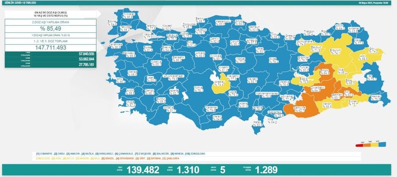 Sağlık Bakanı Fahrettin Koca, 'Türkiye Günlük Koronavirüs Tablosu'nu açıkladı. Tabloya göre 26 Mayıs 2022 tarihinde yapılan 139 bin 482 corona virüsü testinde günlük vaka sayısı 1310 olarak açıklanırken; 5 kişi hayatını kaybetti, 1.289 hasta da iyileşti.