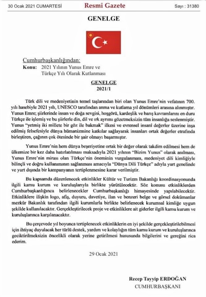 Başkan Recep Tayyip Erdoğan tarafından yayınlanan genelgeyle de 2021 yılı Yunus Emre Yılı olarak ilan edildi. Başkan Recep Tayyip ERDOĞAN'ın imzasıyla 2021 yılının "Yunus Emre ve Türkçe Yılı" olarak kutlanmasına ilişkin Genelge şu şekilde yayımlandı: