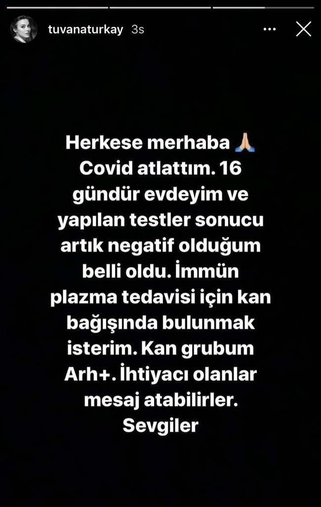 Tuvana Türkay, tüm dünyayı etkisi altına alan corona virüsü salgınına yakalandı. Karantina süreci biten güzel oyuncu sosyal medyadan hastalığı atlattığını açıkladı.