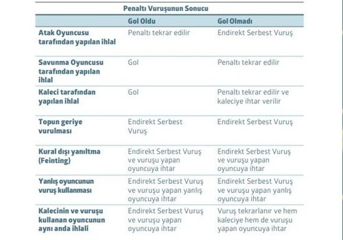 "Her iki takım oyuncusu da oyun kurallarını ihlal ederse, bir oyuncu daha ciddi bir ihlal gerçekleştirmediği sürece (örn. Kural dışı yanıltma) penaltı vuruşu tekrarlanır. Eğer kaleci ve vuruşu yapan oyuncu aynı anda bir ihlal yaparsa: