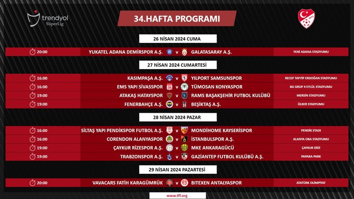 Trendyol Süper Lig'de 34. ve 35. hafta maçlarına ilişkin programlar belli oldu. 34. haftadaki Fenerbahçe - Beşiktaş derbisi 27 Nisan Cumartesi günü saat 19.00'da oynanacak. İşte ayrıntılar... | Son dakika spor haberleri