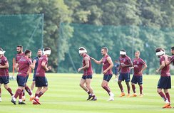 Teknik Direktör Ünal Karaman, yönetiminde yapılan antrenmanın ilk bölümünde bordo-mavililer neşeli bir çalışma gerçekleştirdi. Her antrenmanda farklı çalışma metotları uygulamaya özen gösteren Ünal Karaman, bu kez futbolcuların gözlerini havlu ile bağlayarak bir birleriyle eşleştirdi. Daha sonra arkalarından bir birlerini takip etmelerini istedi. Oyuncularının bir birlerine güven duymalarını isteyen Karaman, sürekli iletişim halinde olarak bir birlerini yönlendirmeleri gerektiğini belirtti. Teknik heyetin bu çalışma programı futbolcular tarafından da oldukça beğenildi.