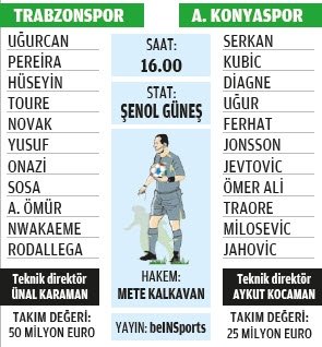 Fenerbahçe ve Kayserispor galibiyetleriyle birlikte yedinci sıraya kadar yükselen Trabzonspor, gözünü üst sıralara dikmiş durumda. Bordo-mavililer, bugün oynanacak Konyaspor ve gelecek haftaki Beşiktaş derbisini kazanarak puanını 28'e çıkararak zirveye tırmanmayı hedefliyor.