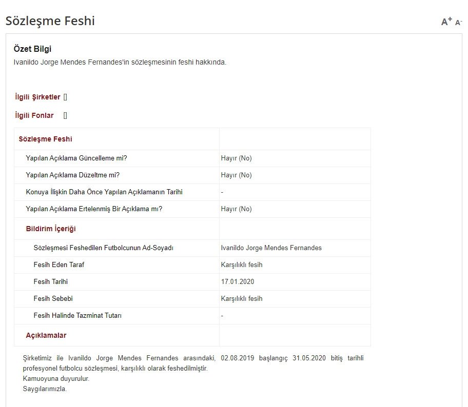 "Şirketimiz ile Ivanildo Jorge Mendes Fernandes arasındaki, 02.08.2019 başlangıç 31.05.2020 bitiş tarihli profesyonel futbolcu sözleşmesi, karşılıklı olarak feshedilmiştir."