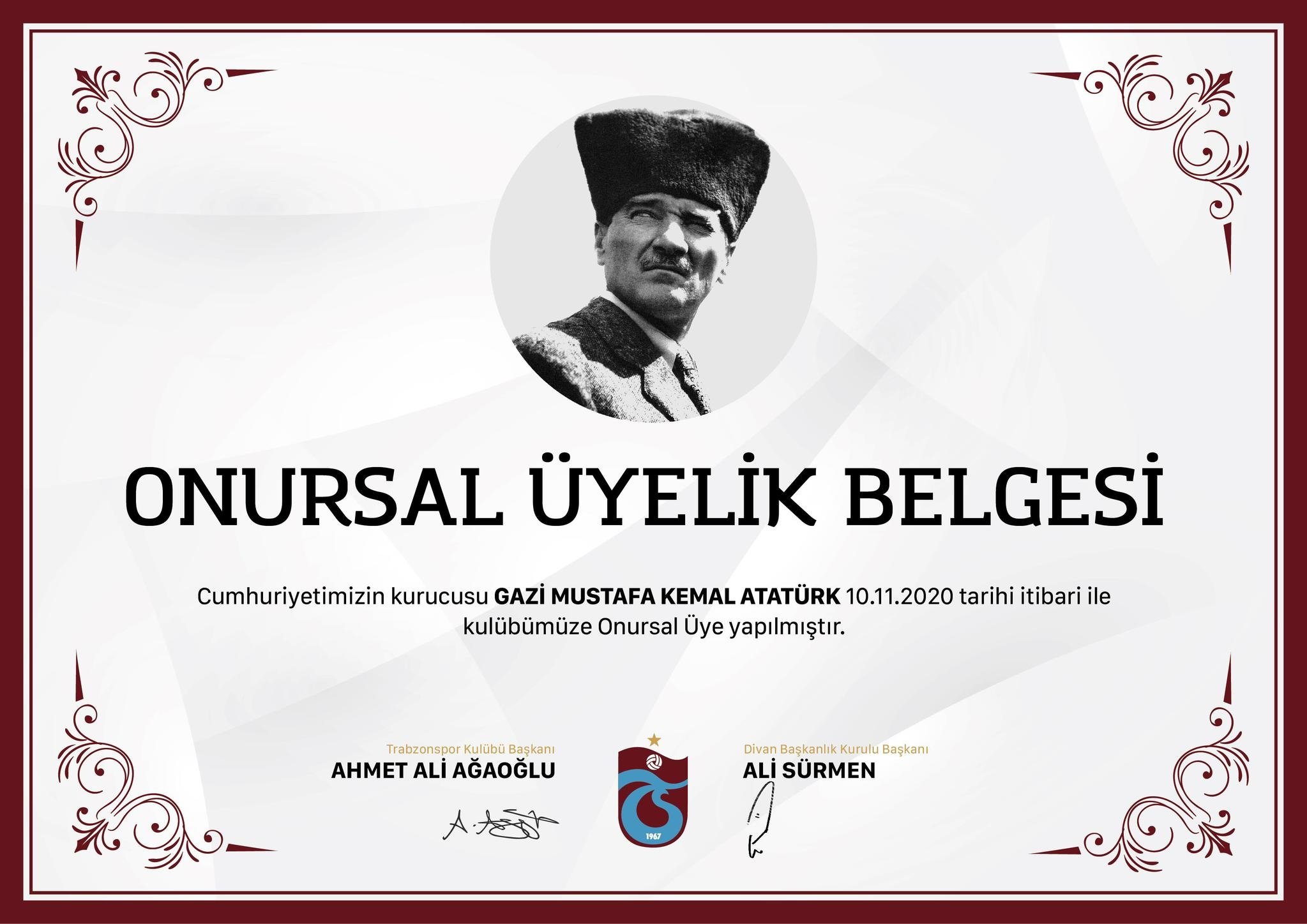 Bordo-mavili kulübün internet sitesinde yer alan açıklamada, Mustafa Kemal Atatürk'ün, tüzüğün 9/c maddesi gereğince divan başkanlık kurulunun önerisi ve yönetim kurulunun 10 Kasım 2020 tarihinde aldığı kararla kulübe onursal üye yapıldığı belirtildi.