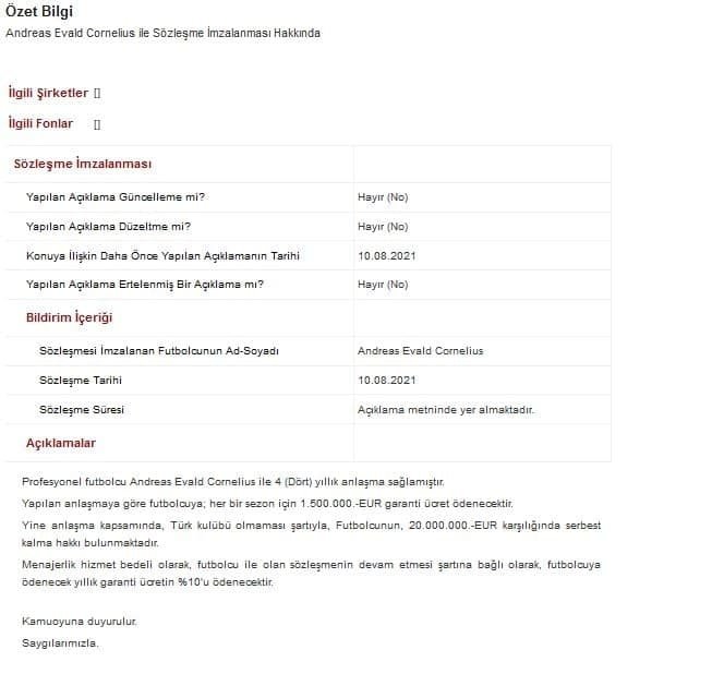Profesyonel futbolcu Andreas Evald Cornelius ile 4 (Dört) yıllık anlaşma sağlamıştır.
