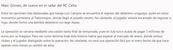 Celta Vigo'nun Gomez transferini sezon sonu için düşündüğü ve önümüzdeki aylarda temasların başlayacağı ifade edildi.