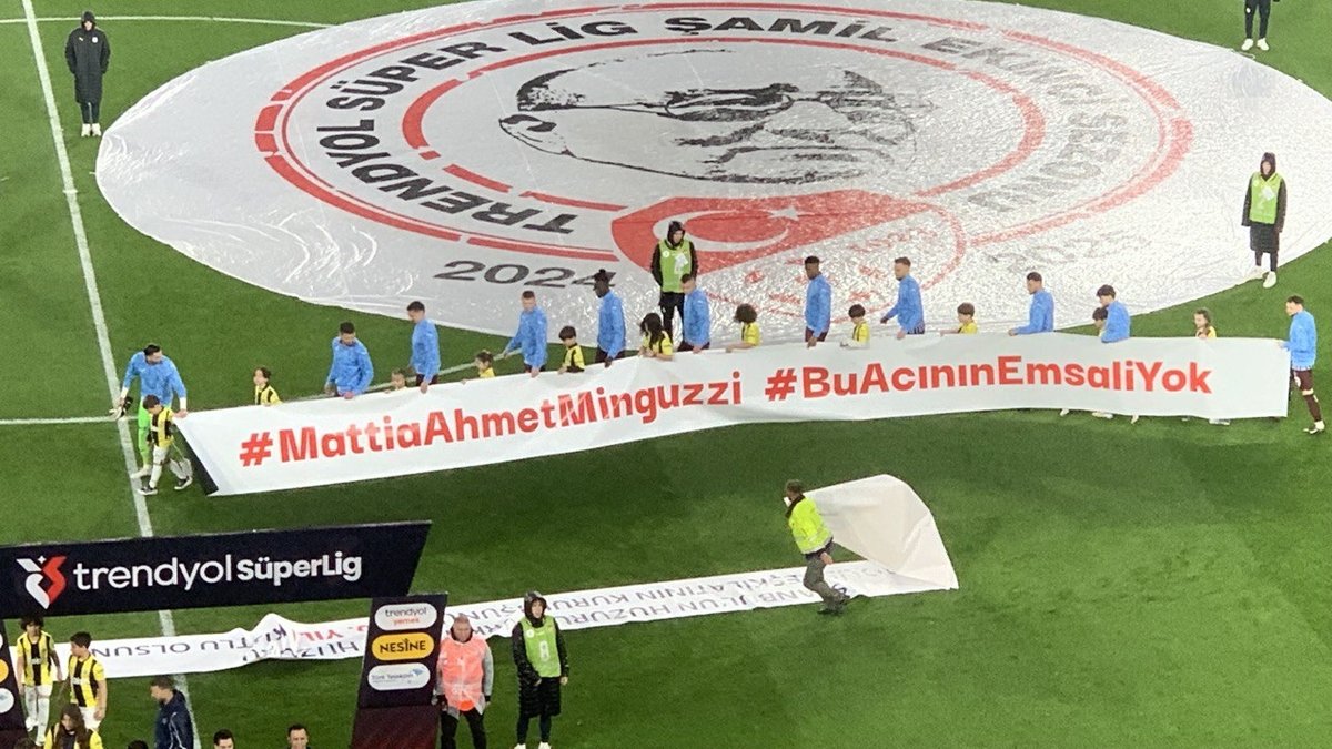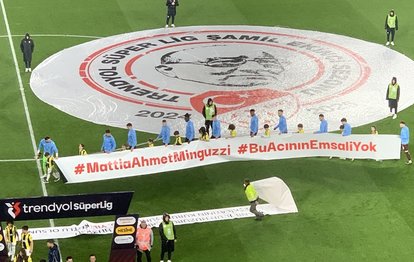 Karşılaşma öncesi bordo-mavili takım sahaya Kadıköy'de uğradığı saldırı sonucu hayatını kaybeden Ahmet Minguzzi'yi anarak çıktı.