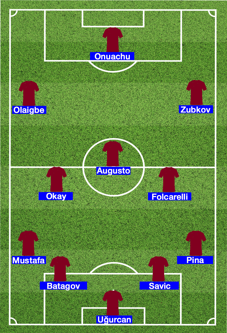 Trabzonspor: Uğurcan, Pina, Savic, Batagov, Mustafa, Okay, Folcarelli, Zubkov, Augusto, Olaigbe, Onuachu